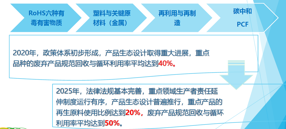 2020年,政策体系初步形成,产品生态设计取得重大进展,重点品种的废弃产品规范回收与循环利用率平均达到40%。 2025年,法律法规基本完善,重点领域生产者责任延伸制度运行有序,产品生态设计普遍推行,重点产品的再生原料使用比例达到20%,废弃产品规范回收与循环利用率平均达到50%。 再制造 再制造与制造新品相比,可节约生产成本50%,节能60%,节材70%,减排80%。 再制造基地 再制造基地主要涵盖工程机械、汽车零部件、机电产品、办公电器、医疗器械、飞机部件、打印耗材。 其还列举了国家再制造产业示范基地(彭州,2016)、国家再制造产业示范基地(浏阳,2009)、入境维修/再制造产业示范基地(北海,2017)、中国飞机再制造基地(哈尔滨,2018)、国家再制造产业示范基地 其还对手机芯片再制造、墨盒再制造等进行了介绍。 电子化学品 一般泛指电子工业使用的专用化学品和化工材料,即电子元器件、印刷线路板、工业及消费类整机生产和包装用各种化学品及材料。按用途可分成基板、光致抗蚀剂、电镀化学品、封装材料、高纯试剂、特种气体、溶剂、清洗前掺杂剂、焊剂掩模、酸及腐蚀剂、电子专用胶黏剂及辅助材料等十几大类,2万多种产品。 贵金属在电子工业中的应用 •2014-2020年,电子行业黄金需求稳定在200-220吨;2021年以来,随着5G、人工智能(AI)、服务器等高端电子设备的普及,需求持续增长至2024年的250吨(占工业需求的64.1%)。 •电子电气领域白银需求量由19 年的10180吨增长至24 年的14323 吨。 循环经济与绿色低碳发展 废弃物也是关键原材料:稀土、贵金属、有色金属、黑色金属。 我国循环经济发展过程: 其对中华人民共和国循环经济促进法的开始制订、颁布、实施、讨论修订、修正以及征求意见等进行了梳理。 绿色低碳模式: 收益= 收入−成本±碳税。 绿色GDP=GDP总量−(环境资源成本+环境资源保护服务费用)。 生态系统生产总值GEP= EPV+ERV+ECV (物质产品价值、调节服务价值和文化服务价值)。 》点击查看2026 SMM铂族金属供需交易峰会报道专题 |