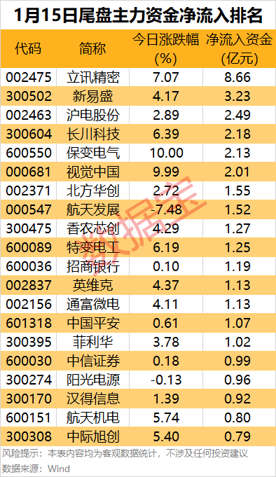 6股尾盘获主力资金净流入均超2亿元 据数据宝统计,尾盘两市主力资金净流入49.73亿元,其中创业板尾盘净流入5.5亿元,沪深300成份股尾盘净流入37.04亿元。 从个股来看,23股尾盘主力资金净流入金额均超7000万元,其中6股尾盘主力资金净流入均超2亿元。 立讯精密尾盘主力资金净流入8.66亿元,居首;新易盛、沪电股份和长川科技等尾盘主力资金净流入均超2亿元。