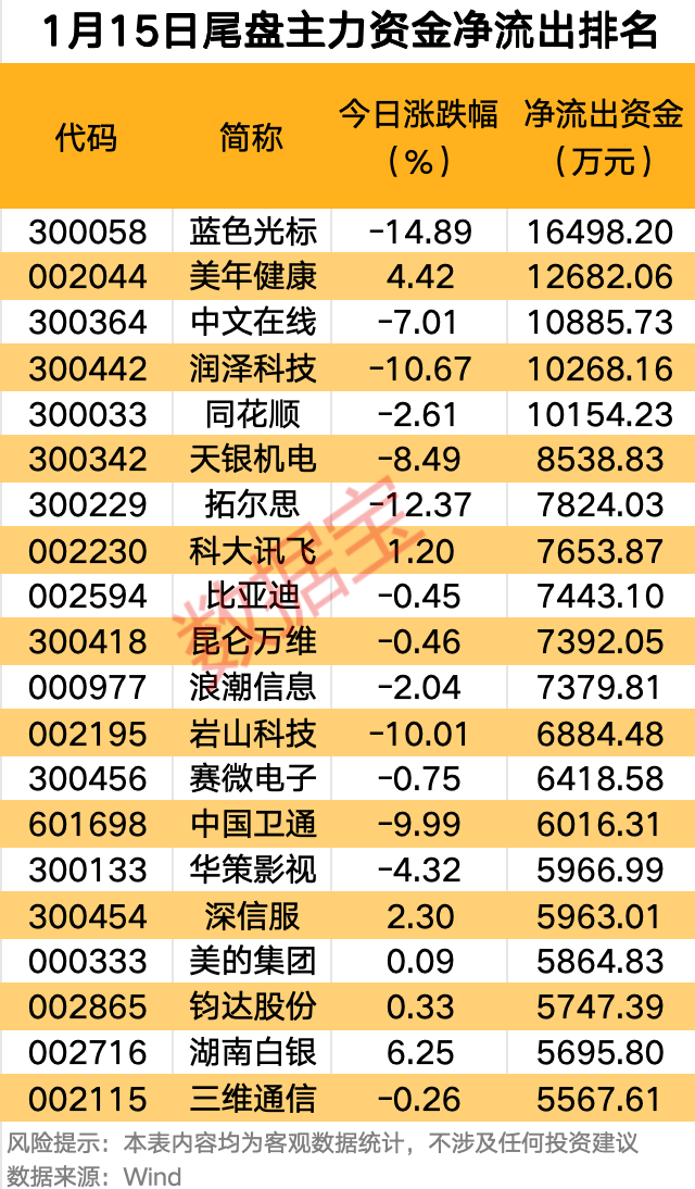 据数据宝统计,27股尾盘主力资金净流出金额均超5000万元,其中5股尾盘净流出均超1亿元。蓝色光标尾盘主力资金净流出1.65亿元,居首。 此外,还有美年健康、中文在线、润泽科技、同花顺和天银机电等尾盘主力资金净流出金额居前。