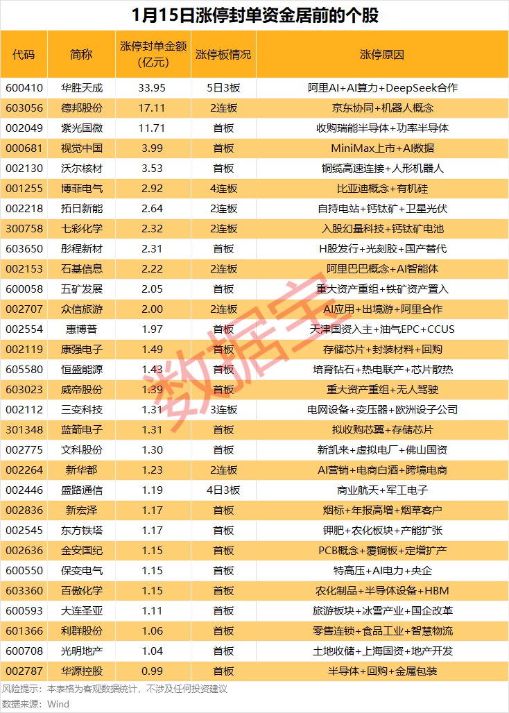 截至今日(1月15日)收盘,上证指数报收4112.6点,下跌0.33%;深证成指收于14306.73点,上涨0.41%。创业板指上涨0.56%;科创50指数下跌0.46%。 不含未开板新股,今日可交易A股中,上涨个股超2200只,占比超40%,下跌个股超3100只。其中,收盘封死涨停的有63股,跌停股有72股。另外,29股封板未遂,整体封板率为68.48%。 据证券时报·数据宝统计,封死涨停的个股中,以所属行业来看,上榜个股居前的行业有基础化工、电子、电力设备,上榜个股分别有8股、7股、5股。 封死涨停股中,*ST阳光、ST百灵等8股为ST股。从连续涨停天数看,*ST阳光、博菲电气、人民网等已连收4个涨停板,连续涨停板数量居前。 以封单金额计算,29股封单金额超1亿元,其中华胜天成、德邦股份、紫光国微等涨停板封单金额居前,分别为33.95亿元、17.11亿元、11.71亿元。 从封单力度来看,华胜天成、德邦股份、博菲电气等力度较大,分别为12.68%、9.93%、8.19%。