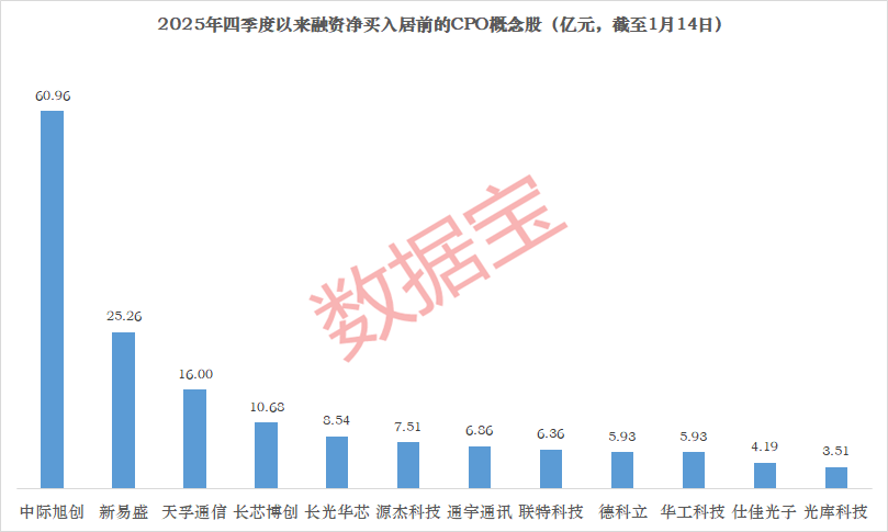 消息面上,英伟达于2026年1月14日宣布,GB300 AI服务器将于2026年二季度开始大规模交付。 中信建投指出,随着GPU和ASIC的快速升级迭代,算力性能持续提升,同时对于数据传输需求也大幅增长。800G光模块的高增速已经能够反映出AI对于带宽迫切的需求。2026年,800G光模块需求预计将继续保持高速增长态势,而1.6T的出货规模也将大幅增长,3.2T光模块的研发也正式开始布局。 行业研究机构LightCounting预测,2029年全球光模块市场规模有望突破370亿美元。该机构同时指出,1.6T光模块于2025年进入商用元年,全球需求预计为250万至350万只。 CPO概念股全年利润普遍向好 证券时报·数据宝梳理了2025年四季度以来(截至1月14日),融资资金净买入居前的CPO概念股,金额在3亿元以上的个股共12只,中际旭创、新易盛、天孚通信、长芯博创4股净买入额在10亿元以上。中际旭创遥遥领先,金额高达60.96亿元。 中际旭创是光模块全球龙头,在技术、产能、供应链等具有显著领先优势。招商证券指出,公司通过深度绑定北美头部客户,充分受益于AI算力需求爆发。公司硅光能力突出,并布局NPO、OCS等下一代光互连技术,将长期受益于AI算力投资。1.6T产品率先起量且物料产能准备充分,奠定2026年高速光模块放量基础。