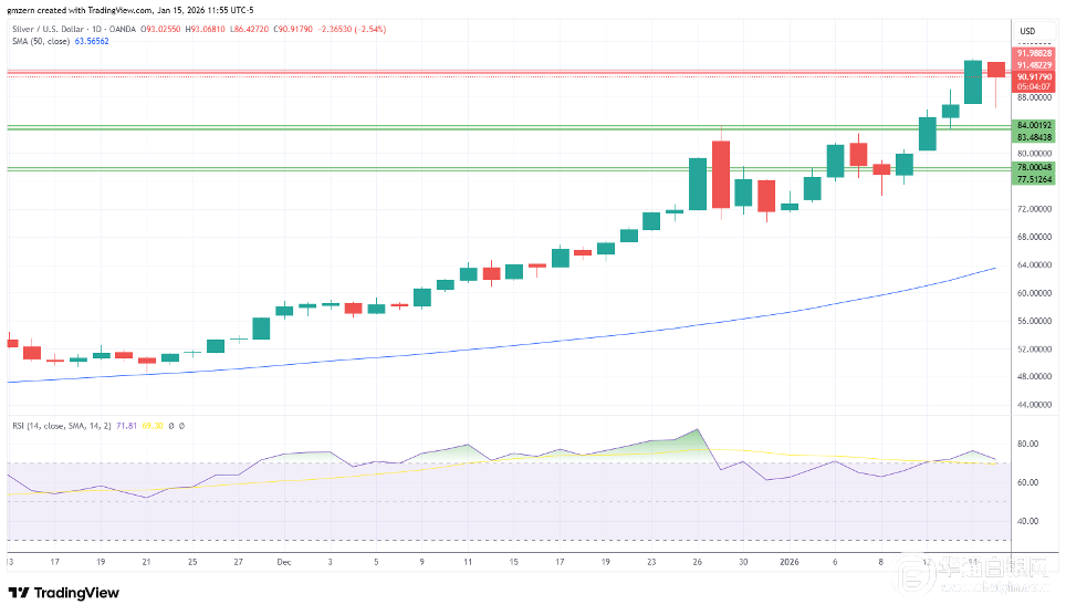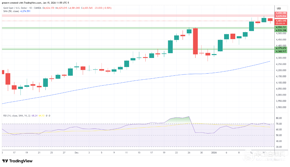 由于交易员在接近历史高位时决定获利了结,黄金价格走低。在美国强劲的就业数据公布后,美元触及数周高位,这给黄金市场带来了更多压力。 从技术层面来看,黄金价格若要获得短期内的进一步上涨动力,就必须突破4640至4650美元阻力位。 白银