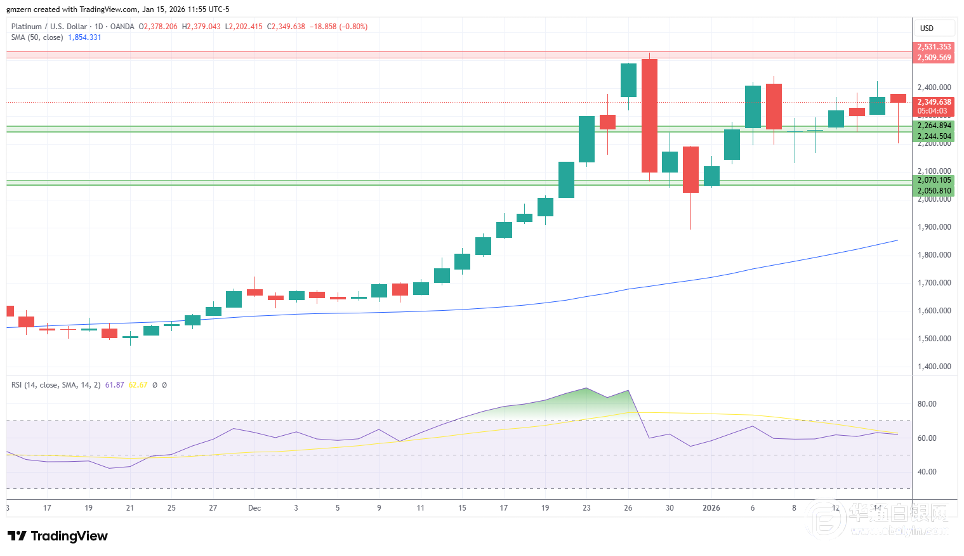 白银遭遇了大幅抛售,试图跌破87.00美元水平。然而,交易员利用这一回调机会增加了多头仓位,并将白银推回了91.00美元上方。 如果银价保持在91.00美元以上,则将会向最近的阻力位91.50美元至92.00美元区域移动。 铂金