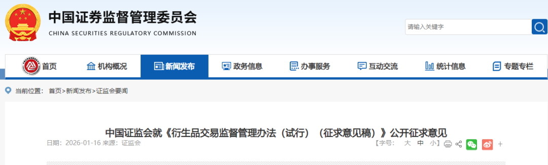 1月16日,证监会发布《衍生品交易监督管理办法(试行)(征求意见稿)》(简称《管理办法》),是证监会首部衍生品市场部门规章公开征求意见,意在支持鼓励衍生品交易发挥管理风险、服务实体经济等功能,同时加强监测、监控、监管,有效防范风险。