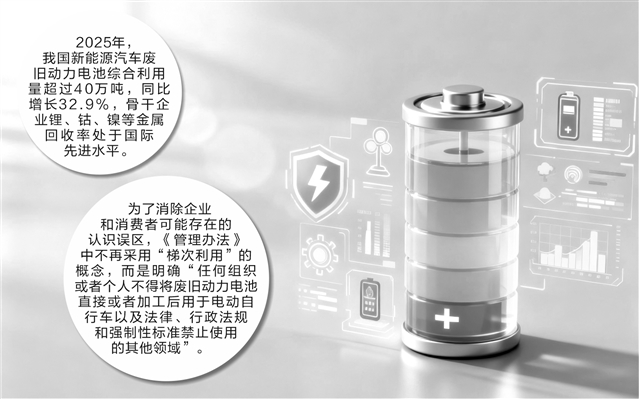证券时报记者 韩忠楠 1月16日,工业和信息化部、国家发展改革委、生态环境部、交通运输部、商务部、市场监管总局等六部门发布消息,已于近日联合印发《新能源汽车废旧动力电池回收和综合利用管理暂行办法》(以下简称《管理办法》)。《管理办法》将于2026年4月1日起施行,同时废止4项原有相关规定,以法治化手段构建规范、安全、高效的废旧动力电池回收利用体系,为新能源汽车产业高质量发展筑牢“最后一公里”防线。 当日,工信部召开新闻发布会,介绍《管理办法》有关情况。工业和信息化部节能与综合利用司司长王鹏表示,废旧动力电池回收利用是新能源汽车和动力电池产业绿色发展的重要一环。做好废旧动力电池回收利用工作,关系到我国新能源汽车和动力电池产业高质量发展,关系到生态环境保护,也关系到重要资源供给,更关系到人民群众生命财产安全。 将进入规模化“退役”阶段 近年来,我国新能源汽车产业快速发展,产销量持续攀升。根据行业协会统计,2025年我国新能源汽车产销分别完成1662.6万辆和1649万辆,同比分别增长29%和28.2%,新能源汽车新车销量达到汽车新车总销量的47.9%。 动力电池是新能源汽车的核心部件,当电池使用过程中容量衰减至一定程度时,将进入“退役”阶段,需要进行回收处理。据有关研究机构测算,我国即将进入动力电池规模化“退役”阶段,到2030年,当年的废旧动力电池产生量预计将超过100万吨。 据悉,此前工信部等有关部门已围绕建设废旧动力电池回收利用体系开展一系列工作,出台了30余项有关标准,持续组织开展动力电池回收利用专项检查调研。 公开数据显示,2025年,我国新能源汽车废旧动力电池综合利用量超过40万吨,同比增长32.9%,骨干企业锂、钴、镍等金属回收率处于国际先进水平。 为进一步完善废旧动力电池回收和综合利用体系,2025年2月,国务院办公厅印发了《健全新能源汽车动力电池回收利用体系行动方案》(以下简称《行动方案》),要求加快制定相关法规规章,用法治化手段规范回收利用。 王鹏表示,此次出台的《管理办法》是落实《行动方案》的重要举措,遵循了“全渠道、全链条、全生命周期”管理的基本思路。 划定行业发展红线 废旧动力电池回收利用涉及企业多、流程长、渠道复杂,监管难度大。为了打通管理堵点卡点,《管理办法》构建了全方位监督体系,多项创新举措引起行业广泛关注。 在渠道方面,《管理办法》强调要抓好电池生产、车辆报废、换电运营、维修更换等各类废旧动力电池产生源头的规范管理,重点设计“车电一体报废”等制度,以防止出现废旧动力电池流向难以掌握的情况。 同时,《管理办法》强调将从全生命周期加强废旧动力电池的信息溯源管理,搭建全国新能源汽车动力电池溯源信息平台,建立新能源汽车动力电池数字身份证管理制度,明确动力电池编码、信息报送等要求,运用数字化技术加强动力电池流向监测。 王鹏透露,动力电池数字身份证是一个综合性的信息载体,不仅包含产品类别、产品构成、报废回收等信息,未来还将根据产业发展和行业管理的需要进一步拓展信息的范围及具体内容。 对未按要求交售废旧动力电池、不履行回收责任、违反编码和信息报送要求等行为,《管理办法》设定了责令改正、警告、罚款等行政处罚措施,并明确了行政处罚的实施主体,增强制度的刚性约束。 生态环境部固体废物与化学品司副司长温雪峰表示,下一步,生态环境部将持续强化拆解处理企业常态化执法监管,严肃查处环境违法行为,继续将非法拆解处置行为纳入非法倾倒处置固体废物专项整治行动,推动更多废旧动力电池流入正规回收利用企业,畅通资源循环利用。 不再采用“梯次利用”概念 值得关注的是,《管理办法》首次明确将不再采用“梯次利用”概念。“一段时间以来,一些企业将废旧动力电池在检测、分类、拆分、重组等处理的基础上,制造出新的电池产品,应用于通信基站备用电源等领域,也就是我们通常所说的‘梯次利用’电池。”王鹏表示,目前市场上的“梯次利用”产品质量情况参差不齐,企业和消费者难以辨别,对“梯次利用”的概念容易产生混淆。 基于此,多部门在制定《管理办法》过程中,从保障人民群众生命财产安全角度,强调不论以任何方式生产的电池产品都必须符合应用领域的质量标准要求。为了消除企业和消费者可能存在的认识误区,《管理办法》中不再采用“梯次利用”的概念,而是明确“任何组织或者个人不得将废旧动力电池直接或者加工后用于电动自行车以及法律、行政法规和强制性标准禁止使用的其他领域”。 王鹏强调,对于违反上述规定的行为,有关部门将加强协同、强化监管,依据法律法规、部门规章的规定予以处罚。 |