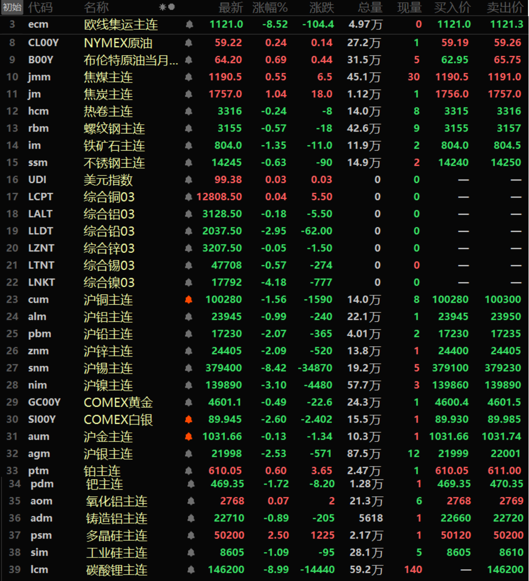 SMM1月17日讯: 金属市场方面: 隔夜内外盘基本金属继续下挫,内盘跌幅多在1%以上,沪锡以8.42%的跌幅领跌,沪镍跌3.1%。沪铅、沪锌一同跌超2%,沪铅跌2.07%,沪锌跌2.09%。沪铜跌1.56%。沪铝跌0.99%。外盘基本金属中,伦镍以4.18%的跌幅领跌,伦铅跌2.95%。伦铜唯一收涨,涨幅达0.04%,其余金属跌幅均在1%以内。氧化铝主连涨0.07%,铸造铝主连跌0.89%。 隔夜黑色系方面多飘绿,铁矿跌1.35%领跌,其余跌幅均在1%以内。双焦一同上涨,焦煤涨0.55%,焦炭涨1.04%。 隔夜贵金属方面,COMEX黄金跌0.49%,周线涨2.23%;COMEX白银跌2.6%,周线大涨13.37%。国内方面,沪金跌0.13%,周线上涨2.57%,沪银跌2.53%,周线大涨22.82%。目前,地缘政治风险正在缓解,摩根大通在周五的一份报告中称,银价面临大幅回调风险,受累于非美国地区供应放松、ETF流出、工业需求趋软等风险上升。 截至1月17日8:46分周五隔夜收盘行情: