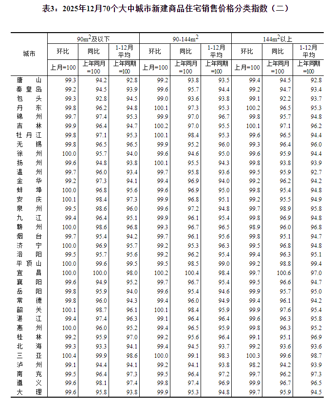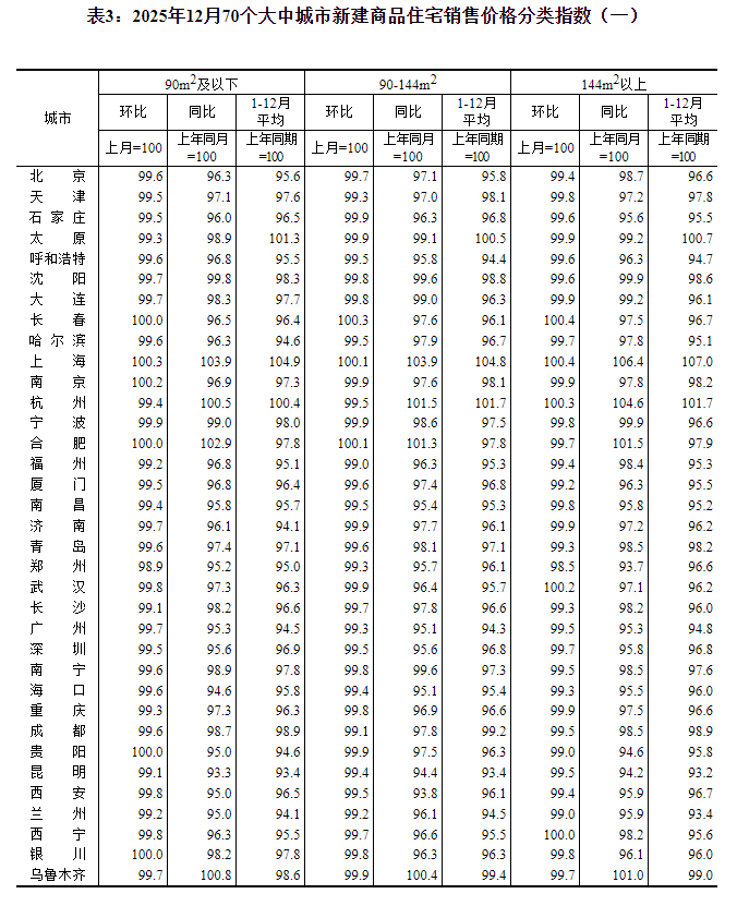 2025年12月份,70个大中城市商品住宅销售价格环比总体下降、同比降幅扩大。 一、一二三线城市商品住宅销售价格环比下降 12月份,一线城市新建商品住宅销售价格环比下降0.3%,降幅比上月收窄0.1个百分点。其中,上海上涨0.2%,北京、广州和深圳分别下降0.4%、0.6%和0.5%。二线城市新建商品住宅销售价格环比下降0.4%,降幅扩大0.1个百分点。三线城市新建商品住宅销售价格环比下降0.4%,降幅与上月相同。 12月份,一线城市二手住宅销售价格环比下降0.9%,降幅比上月收窄0.2个百分点。其中,北京、上海、广州和深圳分别下降1.3%、0.6%、1.0%和0.6%。二、三线城市二手住宅销售价格环比均下降0.7%,降幅均扩大0.1个百分点。 二、一二三线城市商品住宅销售价格同比降幅扩大 12月份,一线城市新建商品住宅销售价格同比下降1.7%,降幅比上月扩大0.5个百分点。其中,上海上涨4.8%,北京、广州和深圳分别下降2.4%、4.8%和4.4%。二、三线城市新建商品住宅销售价格同比分别下降2.5%和3.7%,降幅分别扩大0.3个和0.2个百分点。 12月份,一线城市二手住宅销售价格同比下降7.0%,降幅比上月扩大1.2个百分点。其中,北京、上海、广州和深圳分别下降8.5%、6.1%、7.8%和5.4%。二、三线城市二手住宅销售价格同比均下降6.0%,降幅分别扩大0.4个和0.2个百分点。 注释: 70个大中城市房地产价格统计一二三线城市划分:一线城市指北京、上海、广州、深圳等4个城市;二线城市指天津、石家庄、太原、呼和浩特、沈阳、大连、长春、哈尔滨、南京、杭州、宁波、合肥、福州、厦门、南昌、济南、青岛、郑州、武汉、长沙、南宁、海口、重庆、成都、贵阳、昆明、西安、兰州、西宁、银川、乌鲁木齐等31个城市;三线城市指唐山、秦皇岛、包头、丹东、锦州、吉林、牡丹江、无锡、徐州、扬州、温州、金华、蚌埠、安庆、泉州、九江、赣州、烟台、济宁、洛阳、平顶山、宜昌、襄阳、岳阳、常德、韶关、湛江、惠州、桂林、北海、三亚、泸州、南充、遵义、大理等35个城市。 2025年12月份70个大中城市商品住宅销售价格变动情况