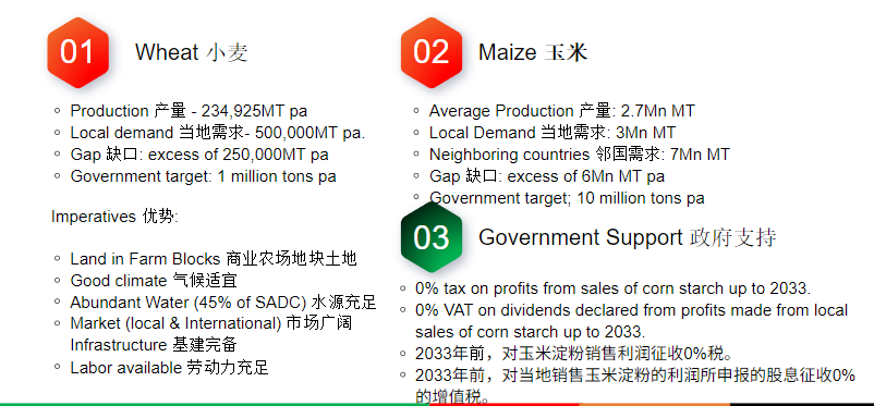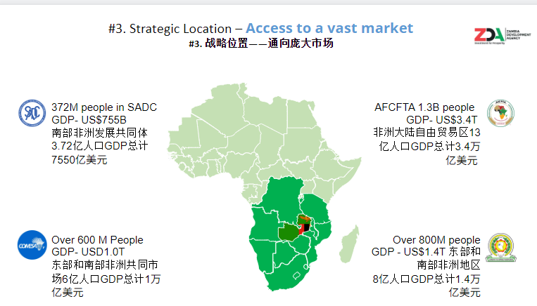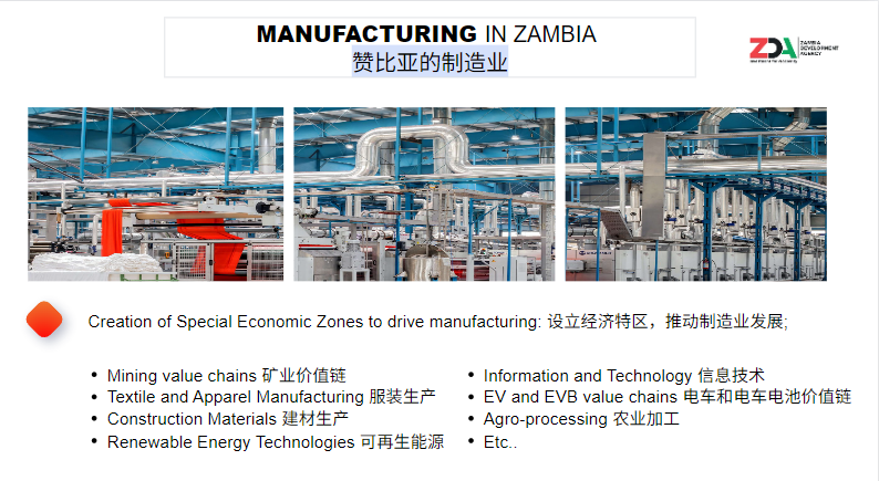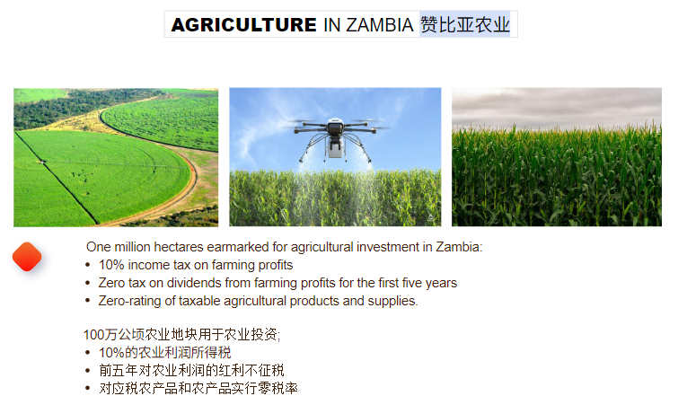 赞比亚的矿业 ♦该国已将所有矿产宣布为关键和战略性矿产,并设定了可实现的目标,即提高从上游到下游的产量和附加值。 ♦监管改革 ♦赞比亚已成立矿产监管委员会,以加强监督并解决生产报告、矿物含量分析和非法开采等问题。 铜产量目标:赞比亚计划到2030年代每年生产300万吨铜。 矿物多元化:拨款用于地质测绘,以支持新矿产的勘探和投资。 地质调查:赞比亚正在进行高分辨率航空调查,以绘制矿产资源地图。 电动汽车和电池投资项目 电车组装市场增长:赞比亚目前的活跃车辆数量约为70万辆,其中只有大约300辆电动汽车,这使赞比亚成为电动汽车电池和组装中心的绝佳机会。 电池生产:赞比亚和刚果民主共和国签署了一份谅解备忘录,以利用其关键矿产,建立非洲最大的电动汽车电池产业。 广阔的市场:赞比亚的战略位置,作为东南非共同市场、南部非洲发展共同体和非洲自由贸易区等区域贸易集团的成员资格,为进入一个巨大的区域市场提供了机会。 赞比亚农业