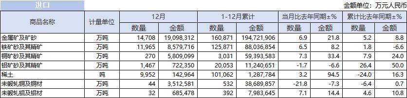 海关总署1月18日公布的数据显示,中国12月铝矿砂及其精矿进口量为1,467万吨,同比减少1.7%。1-12月累计进口量为20,053万吨,同比增加26.4%。