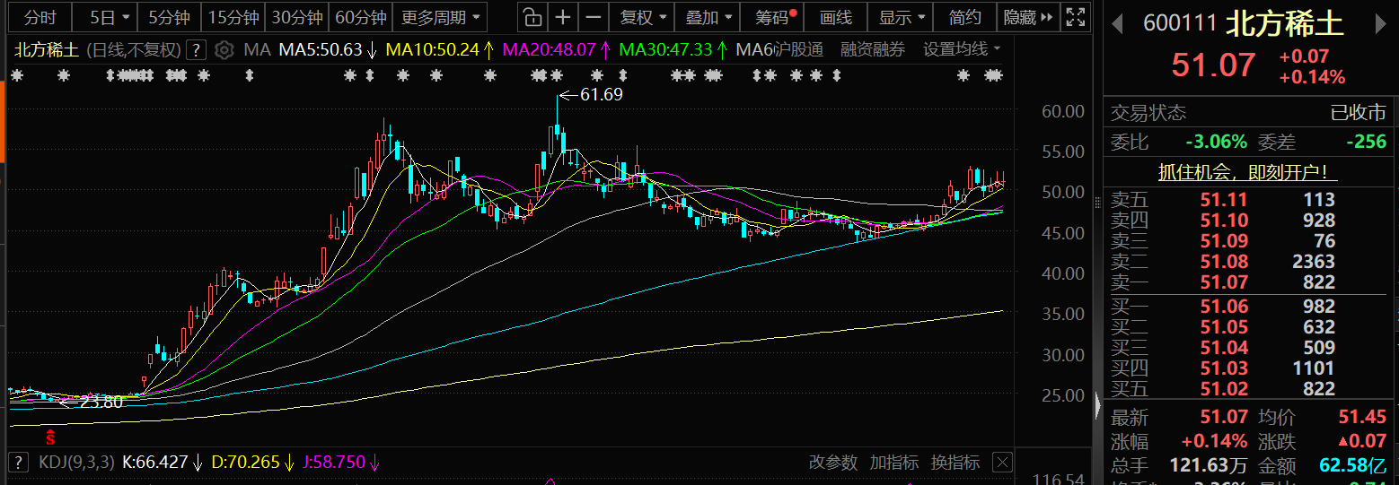 1月19日,北方稀土的股价延续前三个交易日的涨势继续小幅上行,截至19日收盘,北方稀土涨0.14%,报51.07元/股。