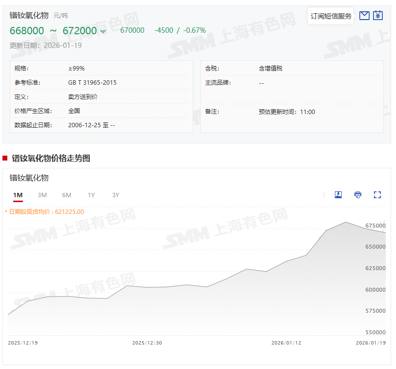 》点击查看SMM稀土现货价格 》订购查看SMM金属现货历史价格走势 据SMM报价显示,1月19日,氧化镨钕价格为668000~672000元/吨,其均价为670000较前一交易日下调0.67%。目前,稀土市场整体呈现弱势稳定态势。镨钕市场方面,下游磁材企业已累积了一定量的金属库存,因此对镨钕金属的采购需求放缓。尽管有头部企业主动低价出货,但市场需求相对冷淡,实际成交量较少,导致价格出现轻微下降。氧化物市场的交易活动也较为低迷,然而卖家普遍不愿意大幅降价,报价虽有所下调,但幅度有限。在磁材企业采购放缓的影响下,稀土市场的询单量有所减少,虽然整体价格保持弱稳运行,但是上游持货商的报价态度依然坚定,形成了上下游之间的持续博弈局面。预计短期内,这种上下游的博弈僵持将继续影响稀土价格,使其维持高位震荡的趋势。 此外,对于稀土的后市,中信证券研报指出,全球稀土资源战略地位持续提升,稀土产业进入高质量发展新时代。供给层面,配额管制叠加管制政策,刚性逻辑或持续加强;需求层面,新能源汽车、人形机器人和低空经济等新兴领域有望成为需求长期高速增长的核心驱动,我们预计2026年起全球稀土供需缺口或持续扩大,稀土价格或稳中有进,产业链盈利能力或持续提升,持续推荐稀土产业链战略配置价值。 |