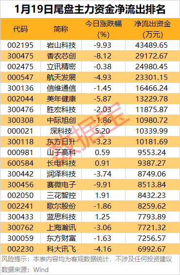 尾盘主力资金净流出方面,岩山科技、香农芯创、立讯精密、航天发展尾盘主力资金净流出金额均超2亿元;信维通信、美年健康、胜宏科技、中际旭创等尾盘主力资金净流出金额均超1亿元。