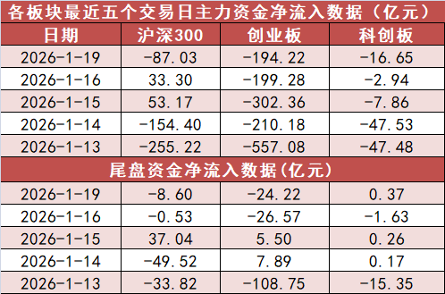 盘后数据出炉。 1月19日,A股市场整体涨跌互现。截至收盘,上证指数报4114点,上涨0.29%;深证成指报14294.05点,上涨0.09%;创业板指报3337.61点,下跌0.7%;北证50指数上涨0.02%。 1.A股市场主力资金净流出397.98亿元 今日A股市场主力资金开盘净流出162.72亿元,尾盘净流出58.29亿元,A股市场全天主力资金净流出397.98亿元。
