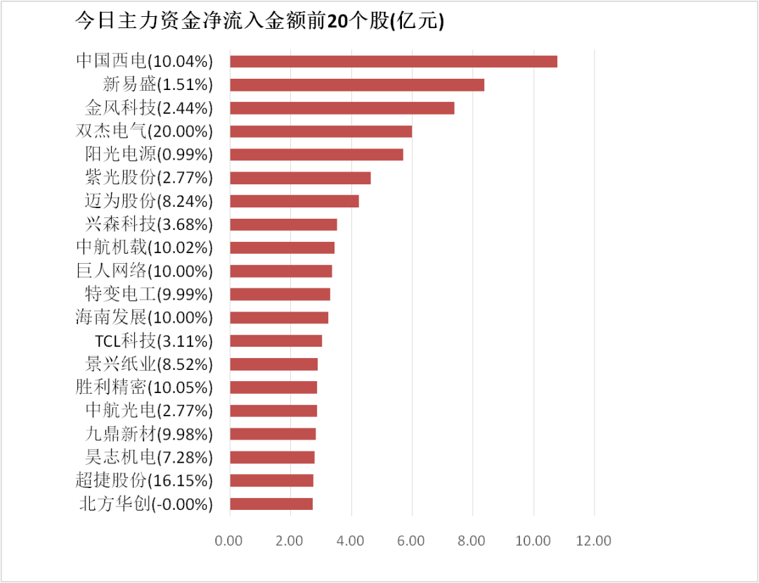 4.中国西电主力资金净流入10.76亿元居首