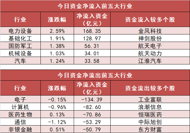 3.电力设备行业净流入168.35亿元居首 申万一级行业中,21个行业实现资金净流入,其中电力设备行业净流入168.35亿元居首。