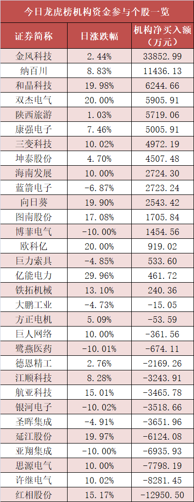 (注:此表为主力资金净流入统计,与上一张表及下一张表的机构净买入统计口径均不同) 5.龙虎榜机构抢筹多股 盘后龙虎榜数据显示,机构现身多股,其中金风科技等股票呈现机构资金净买入,红相股份等股票呈现机构资金净卖出。