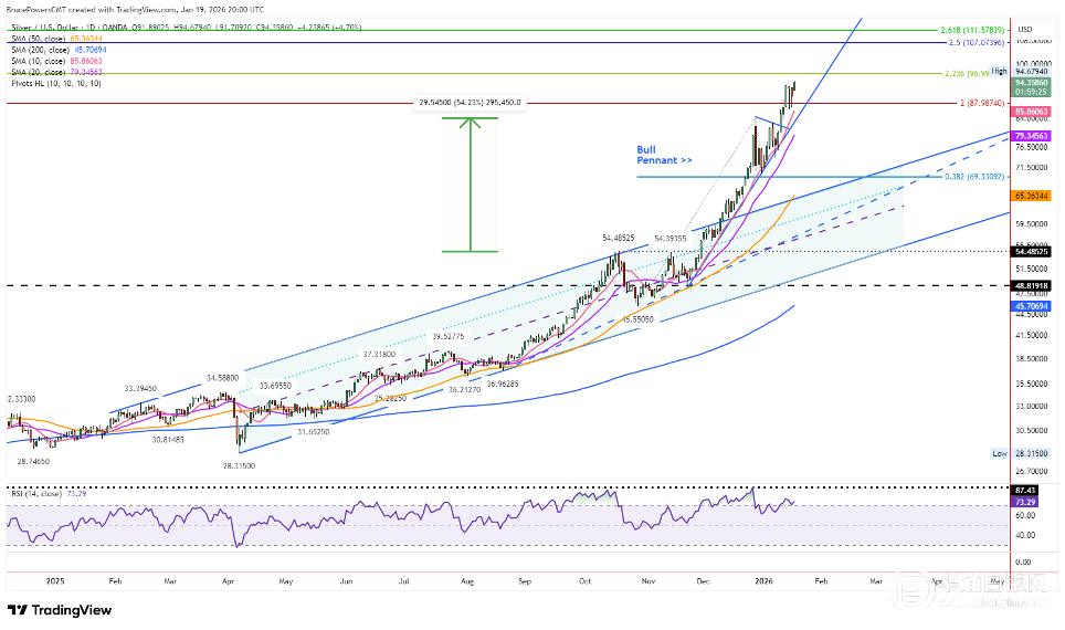 【华通白银网1月20日】突破至新高确认多头掌控 白银价格周一飙升至历史新高94.68美元,并成功突破此前在93.51美元上方形成的三日盘整区间,表明多头依然牢牢掌控趋势,上涨动能有望进一步延伸。当日低点91.71美元恰好位于前三个交易日横盘区间上沿,显示出强劲的买盘承接力,最终推动白银价格突破阻力创出新高。由于周一是马丁·路德·金纪念日假期,交易时段缩短,突破的有效性仍需后续交易日进一步确认。若白银价格能持稳于93.51美元原阻力位转支撑位上方,则上行目标可看至96-97美元区间;反之若回落至91.71美元下方,则短期可能重新进入震荡整理。