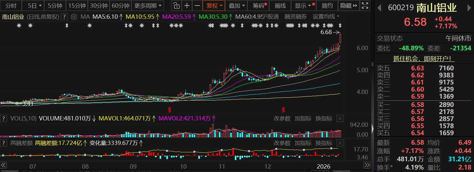 该项目的建设范围是电解铝厂的主要生产设施,项目建设期2年。公告显示,本项目产品初定为给下游加工单位提供铝水,用于深加工。印尼项目是南山铝业为布局国际化战略而打造的海外铝产业,主要面向国外市场,由于东盟及南亚地区人口众多,消费潜力巨大,经济活跃,无论初级铝锭还是后续深加工均可辐射东南亚市场,同时也可兼顾自身业务需求。 提及该举措对上市公司的影响,南山铝业称,本项目是基于公司海外市场中长期发展规划,是公司全球化产业布局的重要举措,依托印尼氧化铝资源禀赋与成本优势,可有效赋能电解铝主业降本增效,在已有电解铝产能建设的基础上,进一步增加公司电解铝产能及提升公司盈利空间,同时积极响应当地市场需求,增强公司海外业务的弹性和韧性,助力公司海外业务持续稳健发展。 此外,本次投资符合公司总体的发展战略规划和全体股东的利益,更有效地提升公司核心竞争力,不存在损害公司中小股东利益的情形,不会对公司的财务状况及经营成果造成重大不利影响。 受此消息刺激,1月20日南山铝业开盘快速拉涨,盘中一度拉涨7.98%,最高触及6.68元/股,刷新2028年3月以来的新高。截至日间收盘,南山铝业以7.17%的涨幅报6.58元/股。