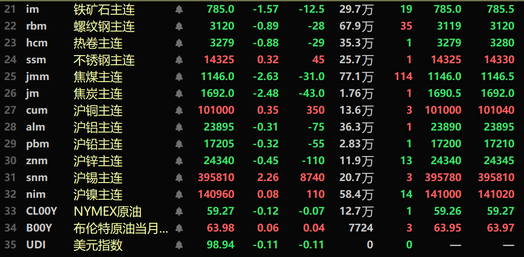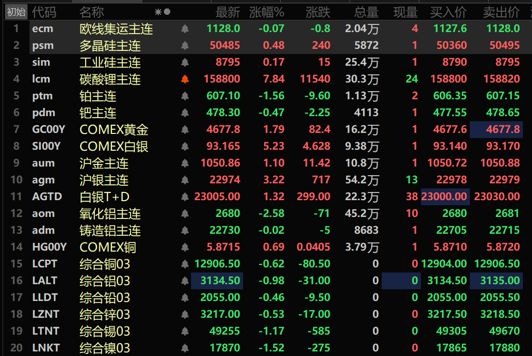 SMM1月20日讯: 金属市场方面: 截至午间收盘,内盘基本金属涨跌互现,沪铜涨0.35%。沪铝跌0.31%。沪铅跌0.32%,沪锌跌0.45%。沪锡涨2.26%。沪镍微涨。 此外,铸造铝主连期货跌0.02%,氧化铝主连跌2.58%。碳酸锂主连涨7.84%。工业硅主连涨0.17%。多晶硅主连涨0.48%。 黑色系多飘绿,铁矿跌1.52%,螺纹跌0.89%,热卷跌0.88%,不锈钢涨0.32%。双焦方面:焦煤主力合约跌2.63%,焦炭主力合约跌2.48%。 外盘基本金属方面,截至11:35分,LME金属全线下跌。伦铜跌0.62%。伦铝跌0.98%。伦铅跌0.46%。伦锌跌0.53%。伦锡跌1.17%。伦镍跌1.52%。 贵金属方面,截至11:35分,COMEX黄金涨1.88%;COMEX白银涨5.23%,盘中刷新历史新高至94.745美元/盎司。内盘贵金属方面:沪金主连涨1.1%,盘中刷新历史新高至1053.74元/克;沪银主连涨3.22%。 此外,截至午间收盘,铂主连期货跌0.44%,钯主连期货涨0.67%。 截至午间收盘,欧线集运主力合约跌0.07%,报1128点。 截至1月20日11:35分,部分期货午间行情: