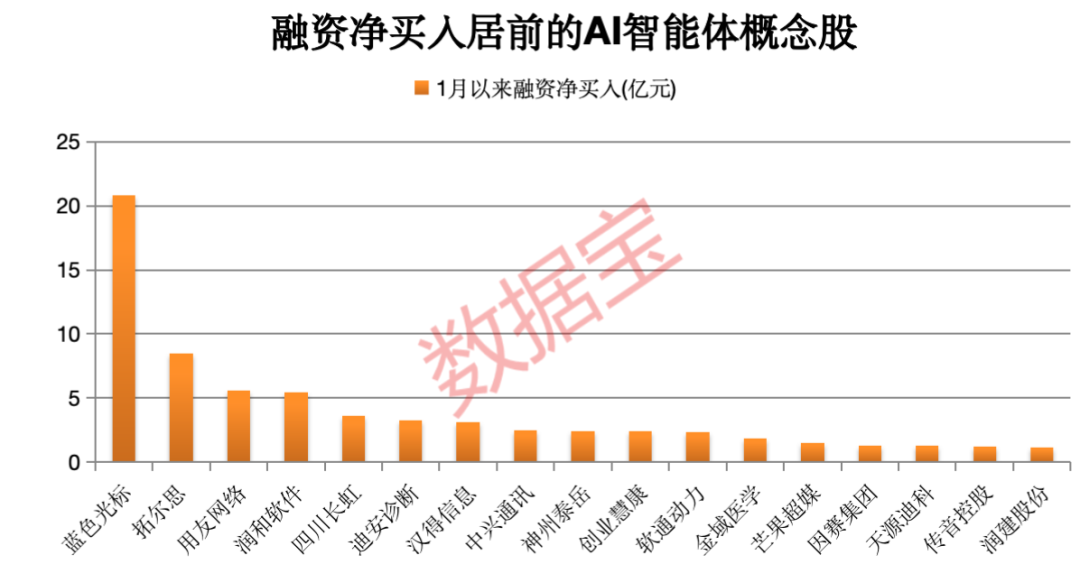 资金流向方面,截至1月19日收盘,上述回撤20%以上的AI智能体概念股中,1月以来获得融资净买入超1亿元的有17只,如蓝色光标、拓尔思、用友网络、润和软件、四川长虹等。 蓝色光标融资净买入额为20.85亿元,排在首位。公司整合营销、达人营销、广告投放、素材优化、内容生成等核心环节孵化了100+垂直场景智能体,推动市场分析、数据追踪、策略优化、创作提效等环节效率持续提升,并形成Agent与Agent的高效联动协作。