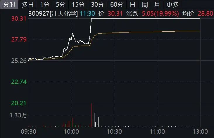 石油化工、日用化工、化学原料、分散染料的细分板块也涨幅居前,江天化学直线20%涨停,维远股份略微低开后仅约11分钟直线涨停,美邦科技、中毅达等涨停或涨超10%。