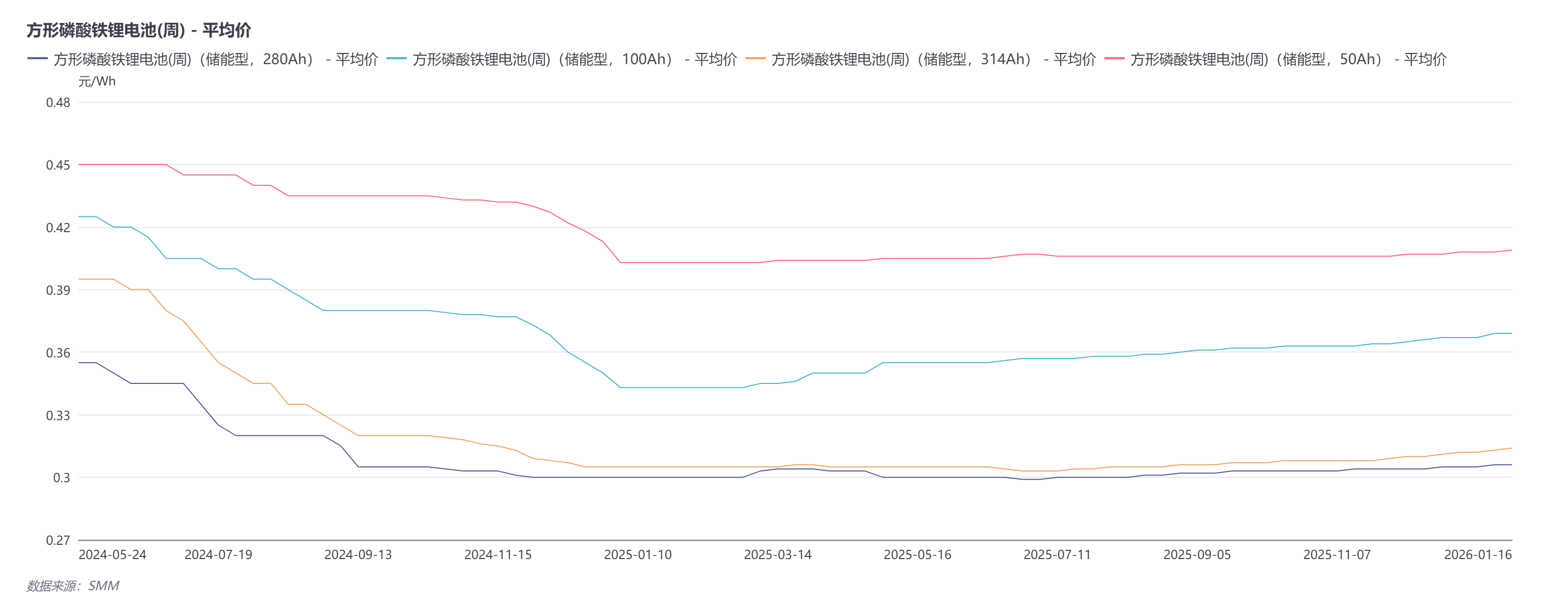 此外,2025年储能业务出货量方面,公司2025 年储能出货超 8GWh,其中海外出货占比超 60%,2026 年计划出货 15-16GWh,目前海外在手订单已超 12GWh,预计 2026 年外销比例将进一步提升。因公司订单饱满度高,未来对于订单会自主选择,或通过外购电芯方式匹配低价值订单。 而众所周知,自2025年三季度以来,国内储能电芯市场便在供需偏紧钟迎来价格拐点。据SMM了解,2025年第三季度,国内外储能时长需求旺盛,自6月底起部分企业零单报价开始上涨(普遍涨幅在5厘以内),“一芯难求”的局面从一二线厂商蔓延至三四线企业。进入7月底8月初,一二线厂商排产已普遍安排至11月,需求对零单涨价的支撑持续存在,但部分下游集成厂商采购意愿转弱,对高价零单仅维持刚需采购。成本端,整个三季度碳酸锂价格呈现震荡抬升的态势。 进入2024年四季度,储能市场供需偏紧的态势仍未缓解,成本再承压,带动储能电芯价格一路走高:季度内,电芯价格呈现稳中有升的态势,280Ah与314Ah规格电芯均价分别从10月的0.303元/Wh和0.308元/Wh,攀升至11月的0.305元/Wh和0.312元/Wh。成本端面临巨大压力,314Ah电芯成本在季度内环比增幅从10月的3.5%扩大至11月的5.6%,主要因四大主材价格普涨:磷酸铁锂厂商上调加工费,隔膜企业完成第二轮提价,电解液价格涨幅更高达20%,材料厂进入积极的利润修复阶段。供需格局依然紧张,国内“1230”并网节点驱动项目集中落地,同时海外订单多地开花,共同支撑电芯企业维持高开工率与高节奏出货,市场保持供不应求态势。 而进入2026年以来,储能电芯价格依旧持续上涨,以储能型280Ah方形磷酸铁锂电池(周度)报价来看,截至2026年1月16日,其现货报价涨至0.2778~0.334元/Wh,均价报0.306元/Wh,相较2025年12月31日的0.305元/Wh上涨0.001元/Wh,涨幅达0.33%。