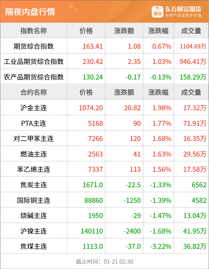 隔夜行情![]() ![]() 每日精选成品油价年内首次上调 加满一箱油多花3.5元左右 上期所:调整铜等期货相关合约交易保证金比例和涨跌停板幅度 现货白银冲上95美元逼近“百元时代” 特朗普关税威胁引发避险大逃亡 宏观产经新华社:1月20日,财政部副部长廖岷在国新办新闻发布会上表示,2026年,财政部门将继续实施更加积极的财政政策,概括起来就是“总量增加、结构更优、效益更好、动能更强”。2026年财政赤字、债务总规模和支出总量将保持必要水平,确保总体支出力度“只增不减”、重点领域保障“只强不弱”。 央视新闻客户端:上海发布《加强期现联动提升有色金属大宗商品能级行动方案》,加强市场之间的联动发展,合力提高上海有色金属大宗商品的资源配置能力和全球定价影响力,助力上海“五个中心”建设。据上海市委金融办介绍,《行动方案》主要包括三部分内容18项措施。 人民财讯:财政部综合司司长李先忠在国新办新闻发布会上表示,近期财政部、税务总局发布公告,明确自2026年4月1日起取消光伏等产品出口退税,并分两年取消电子产品出口退税。此次出口退税政策调整,有利于促进资源高效利用,也有利于引导产业结构合理调整,综合整治“内卷式”无序竞争,推动经济高质量发展。 品种资讯黑色系期货 铁矿石:2026年1月17日,来自几内亚西芒杜(Simandou)项目的首批20万吨高品位铁矿石抵达马迹山港,这标志着全球供应格局的重大转变。虽然该项目设计的总年产能高达1.2亿吨,但预计2026年出口量为1800万吨。这一高品位供应(含铁量65%)预计将使海运市场多元化,为澳大利亚和巴西矿石提供结构性替代选择。(上海有色网) 据Mysteel,1月20日,全国主港铁矿累计成交116.5万吨,环比下跌2.43%;本月平均每日成交97.3万吨,环比下跌5.07%。当天远期现货累计成交151.5万吨(14笔),环比上涨102.00%,其中矿山成交量为134.5万吨。(我的钢铁网) 钢材:2025年12月,全国生产粗钢6818万吨、同比下降10.3%,日产219.94万吨/日、环比下降5.6%;生产生铁6072万吨、同比下降9.9%,日产195.87万吨/日、环比下降5.7%;生产钢材11531万吨、同比下降3.8%,日产371.97万吨/日、环比下降3.7%。(中钢协) 截至2026年1月20日,11家钢厂发布2026年冬储政策,其中东北4家,华北3家,西北2家,西南2家,今日新增1家钢厂,2026年1月20日起开始收款,账面余额+上款金额次日起按日计息,月息7厘;可锁价可保价,到款客户优先享有锁价权和保值权,对应金额停止计息;此冬储政策收款截止日期2026年2月10日;提货截止日期2026年5月15日,到期后保值部分未提完款项转为现货款,执行当期销售政策。(我的钢铁网) 农产品期货 生猪:据农业农村部监测,截至1月20日14:00时,全国农产品批发市场猪肉平均价格为18.47元/公斤,较前一日上升0.1%;鸡蛋平均价格为8.13元/公斤,较前一日持平。(新华财经) 棕榈油:AMSPEC数据显示,马来西亚1月1-20日棕榈油出口环比增长8.64%。(财联社) 船运调查机构ITS数据显示,马来西亚1月1日-20日棕榈油出口量为947939吨,较前一月同期出口的851057吨增加11.4%。(新华财经) 棉花:据张家港保税区纺织原料市场公布,截至2026年1月19日,张家港保税区棉花总库存3.57万吨,同比减少0.33%。其中保税棉3.28万吨,同比减少0.36%;非保税棉0.30万吨,同比增加0.37%。(新华财经) 有色/贵金属期货 沪金:波兰央行周二表示,该行已批准一项购买多达150吨黄金的计划,这将使该国的黄金储备增加到700吨。(财联社) 沪铝:国际铝业协会(IAI)数据显示,2025年12月份全球原铝产量为629.6万吨,前一年同期为626.6万吨,前一个月修正值为608.5万吨。(新华财经) 碳酸锂:1月20日碳酸锂现货价格震荡上行。电池级碳酸锂指数价格154099元/吨,环比上一工作日上涨2434元/吨;电池级碳酸锂14.9-15.6万元/吨,均价15.25万元/吨,环比上一工作日上涨1500元/吨;工业级碳酸锂14.5-15.3万元/吨,均价14.9万元/吨,环比上一工作日上涨1500元/吨。(上海有色网) 能化期货 原油:美国财长贝森特称,欧洲继续从印度购买俄罗斯成品油。(财联社) 尿素:山东地区尿素行情偏弱僵持,小颗粒主流出厂成交1700-1760元/吨,大颗粒出厂参考1880-1900元/吨。临沂市场一手贸易商出货参考价格1750-1760元/吨附近,菏泽市场参考价格1730-1740元/吨附近。省内企业生产基本正常。短时部分企业价格小幅松动,但基于情绪的偏弱震荡,厂家新单成交尚未见好转。不过今日周边河南区域企业新单成交好转,参照其价格水平,山东价格稳定或者小幅松动后,也大概率会有适量新单,行情因此僵持波动运行。(隆众资讯) 橡胶:海关统计数据在线查询平台公布的数据显示,中国2025年12月天然及合成橡胶(包括胶乳)进口量为953,230.94吨,环比上升20.62%,同比增长18.45%。泰国是第一大进口来源地。(新华财经) 环球视野新华社:美国总统特朗普19日在得知法国总统马克龙无意加入美国主导的监督加沙地带战后过渡治理的所谓“和平委员会”后,威胁对法国葡萄酒和香槟征收200%的关税。特朗普当天从佛罗里达州乘专机返回首都华盛顿之前在回答媒体提问时表示:“我会对他(马克龙)的红酒和香槟征收200%的关税,然后他就会加入。但是,他并不一定要加入。” 央视网:当地时间1月20日,丹麦经济事务大臣斯蒂芬妮·洛斯表示,在美国总统特朗普威胁要吞并格陵兰岛之后,欧盟必须保留所有可能的应对手段。洛斯说,“目前,我们不应排除任何可能性。我们不想让事
