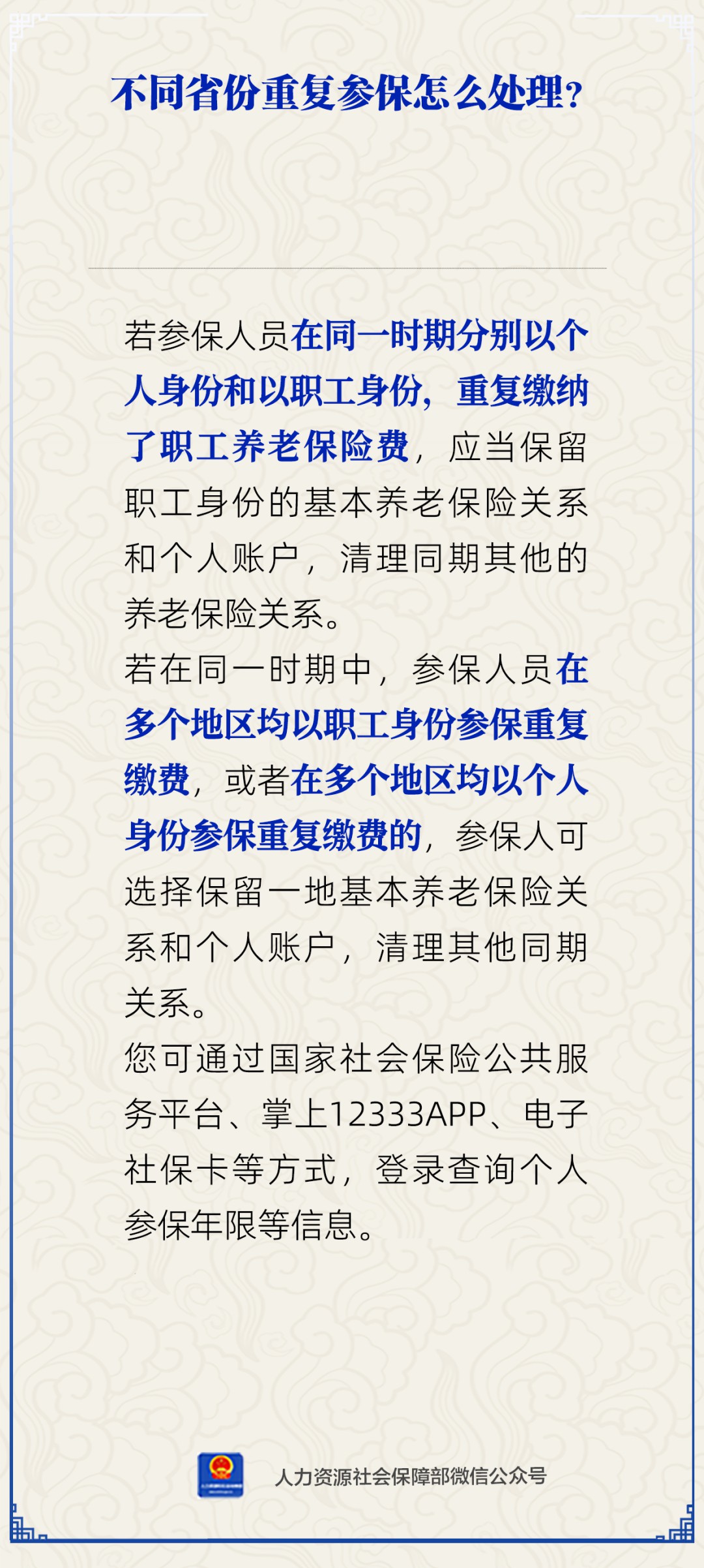 中新网1月21日电 不同省份重复参保怎么处理?人社部1月21日通过官方微信公众号作出解答。 若参保人员在同一时期分别以个人身份和以职工身份,重复缴纳了职工养老保险费,应当保留职工身份的基本养老保险关系和个人账户,清理同期其他的养老保险关系。 若在同一时期中,参保人员在多个地区均以职工身份参保重复缴费,或者在多个地区均以个人身份参保重复缴费的,参保人可选择保留一地基本养老保险关系和个人账户,清理其他同期关系。 您可通过国家社会保险公共服务平台、掌上12333APP、电子社保卡等方式,登录查询个人参保年限等信息。