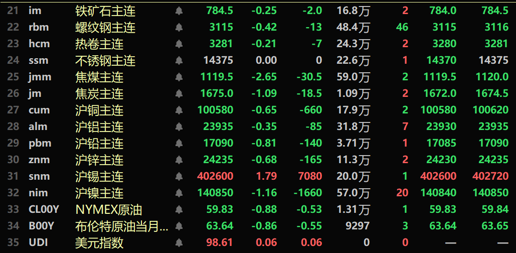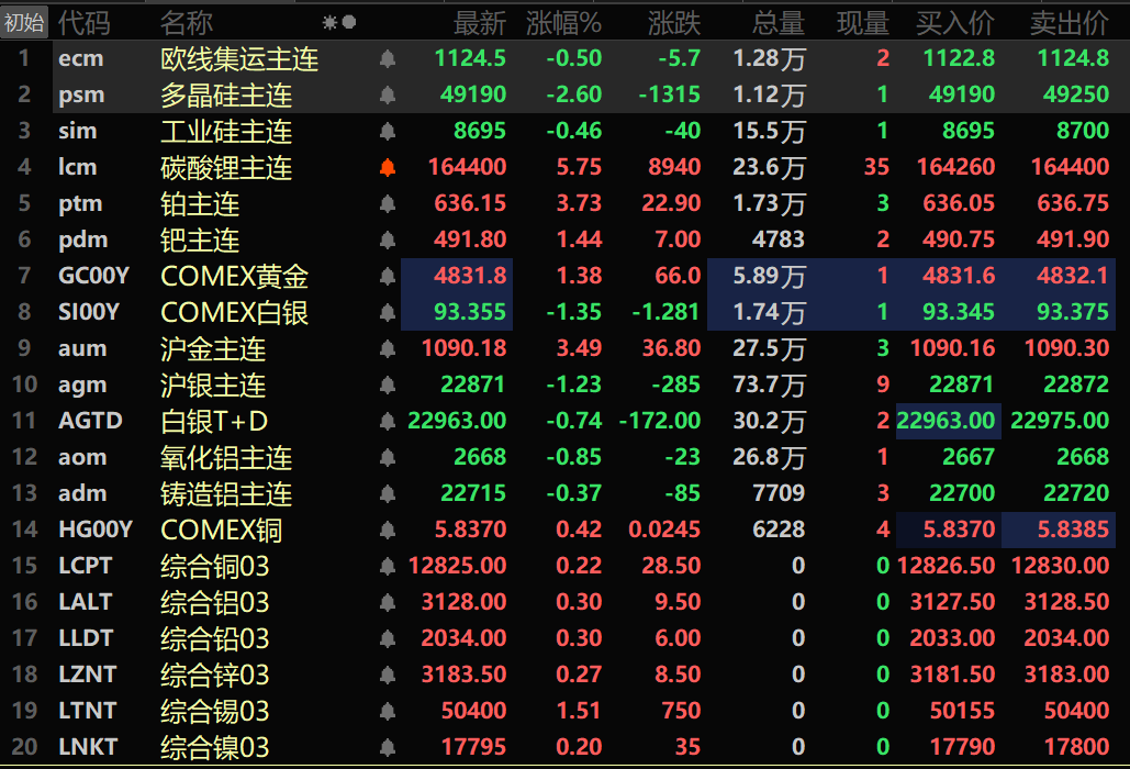 SMM1月21日讯: 金属市场方面: 截至午间收盘,内盘基本金属近全线下跌,沪铜跌0.65%。沪铝跌0.35%。沪铅跌0.81%,沪锌跌0.68%。沪锡涨1.79%。沪镍跌1.16%。 此外,铸造铝主连期货跌0.37%,氧化铝主连跌0.85%。碳酸锂主连涨5.75%。工业硅主连跌0.46%。多晶硅主连跌2.6%。 黑色系多飘绿,铁矿跌0.25%,螺纹跌0.42%,热卷跌0.21%,不锈钢平于14735元/吨。双焦方面:焦煤主力合约跌2.65%,焦炭主力合约跌1.09%。 外盘基本金属方面,截至11:38分,LME金属全线飘红。伦铜涨0.22%。伦铝涨0.3%。伦铅涨0.3%。伦锌涨0.27%。伦锡涨1.51%。伦镍涨0.2%。 贵金属方面,截至11:38分,COMEX黄金涨1.38%,盘中刷新历史新高至4852.6美元/盎司;COMEX白银跌1.35%。内盘贵金属方面:沪金主连涨3.49%,盘中刷新历史新高至1093.48元/克;沪银主连跌1.23%。 此外,截至午间收盘,铂主连期货涨3.73%,钯主连期货涨1.44%。 截至午间收盘,欧线集运主力合约跌0.5%,报1124.5点。 截至1月21日11:38分,部分期货午间行情: