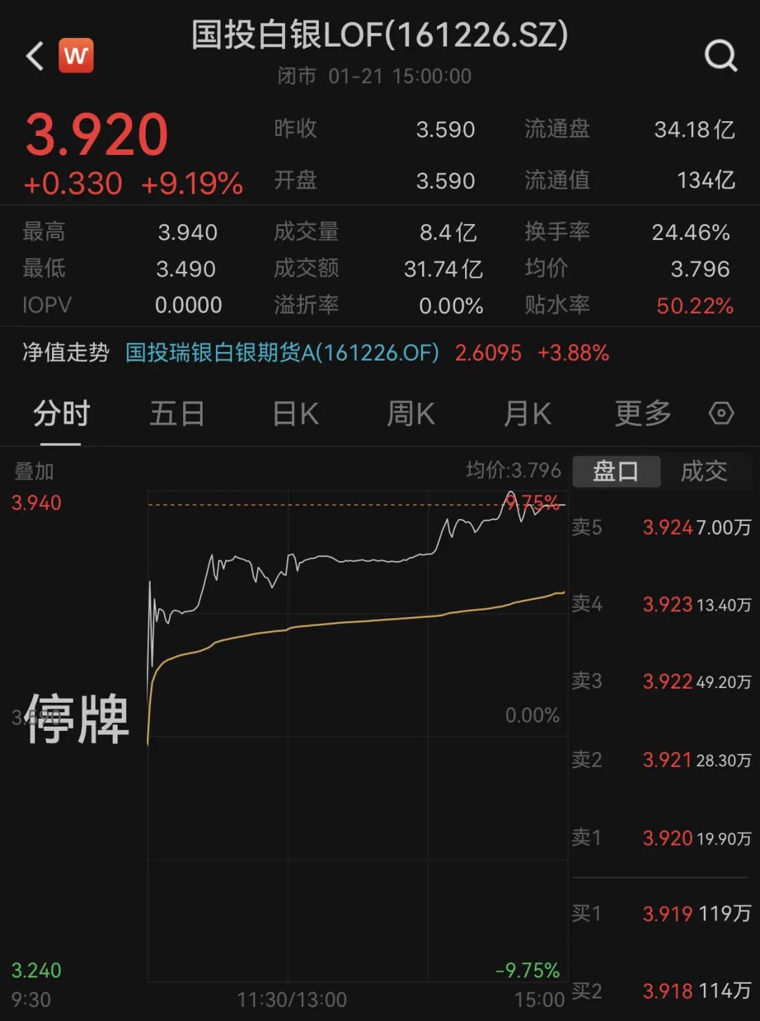 白银基金飙涨,明日全天停牌。 国投瑞银基金管理有限公司1月21日公告,旗下国投瑞银白银期货证券投资基金(LOF)A类基金份额(简称“国投白银LOF”)二级市场交易价格波动较大,请投资者密切关注基金份额净值。 2026年1月20日,国投白银LOF基金份额单位净值为2.6095元,截至2026年1月21日,国投白银LOF二级市场的收盘价为3.920元,明显高于基金份额净值,投资者如果盲目投资于高溢价率的基金份额,可能面临重大损失。为保护投资者利益,国投白银LOF将于2026年1月22日开市起停牌至收市。 若国投白银LOF2026年1月23日二级市场交易价格溢价幅度未有效回落,国投白银LOF有权通过向深圳证券交易所申请盘中临时停牌、延长停牌时间等措施,向市场警示风险,具体以届时公告为准。