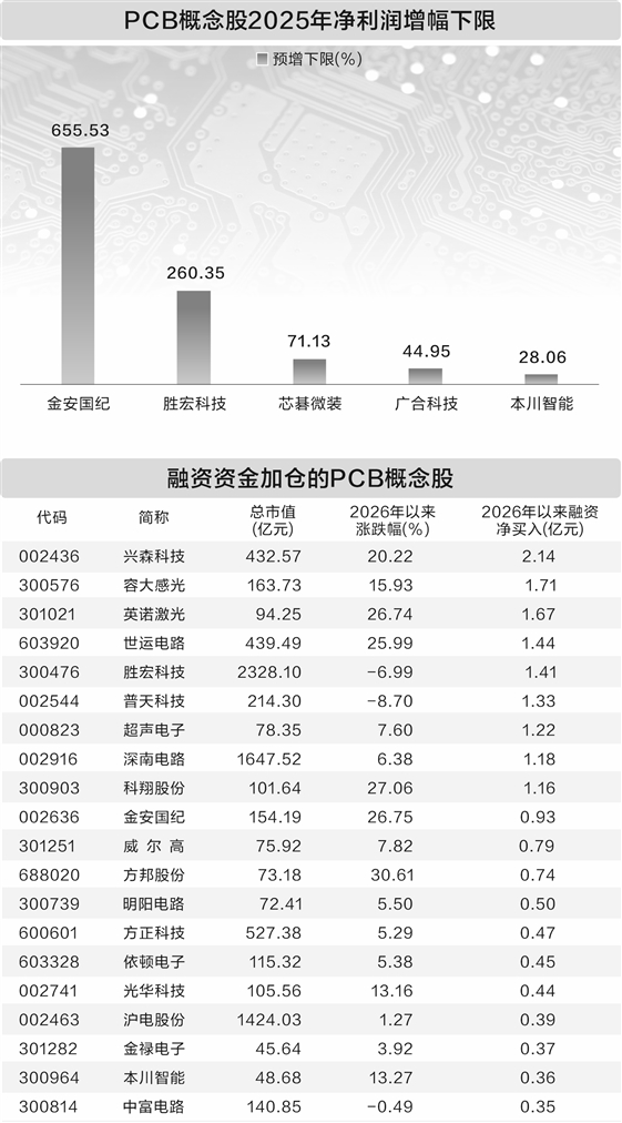 证券时报记者 刘俊伶 1月21日,A股印制电路板(PCB)板块集体走高,Wind PCB概念指数上涨3.77%,其中芯碁微装、科翔股份、英诺激光涨幅超过10%,大族激光、广合科技、奥士康、宏和科技等涨停。 2026年以来,PCB板块持续上行,行业指数累计涨幅超8%,芯碁微装、华正新材、方邦股份等累计涨幅超过30%。 市场规模快速扩容 近年来,AI应用的爆发式发展显著拉动了高端印制电路板的市场需求,推动行业步入高景气周期。以AI服务器、智能驾驶等为代表的新兴领域,对PCB的层数、精度和可靠性提出了更高要求,高密度互联板(HDI)、高多层板等高端品类需求激增,全球PCB企业纷纷加大资本投入,扩产高端产能以把握增长机遇。 据咨询机构Prismark预测,2024年全球PCB市场产值增长约5.8%,2025年全球PCB市场产值增长约6.8%,且未来几年PCB产业将持续增长,到2029年全球PCB产值约946.61亿美元,其间年复合增长率约为5.2%。Prismark还预测,2023年至2028年AI服务器相关HDI的年均复合增速将达到16.3%,为AI服务器相关PCB市场增速最快的品类。 甬兴证券研报认为,AI技术浪潮下算力需求持续攀升,AI服务器和高性能计算相关的PCB市场规模有望快速扩容。中国作为全球领先的PCB制造基地,未来国内相关产业链业绩有望增长。 行业盈利能力向好 1月21日晚间,金安国纪发布2025年度业绩预告,预计实现归母净利润2.80亿元至3.60亿元,同比增长655.53%至871.40%。业绩增长的主要原因系覆铜板市场行情有所好转,公司覆铜板产销数量同比增长、销售价格有所回升,同时公司进一步聚焦主业、优化产品结构,提高盈利水平,因而公司业绩与上年同期相比实现了较大幅度的增长。 据证券时报·数据宝统计,A股中PCB板块个股共有近50只,截至1月21日,已有6股公布2025年度业绩预告,均为预喜,其中金安国纪、胜宏科技、芯碁微装、广合科技、本川智能预计归母净利润同比增长,华正新材预计扭亏为盈。按预告净利润同比增长下限来看,金安国纪幅度最高,增长下限超过6倍。 胜宏科技次之,公司预计2025年实现归母净利润41.6亿元至45.6亿元,同比增长260.35%至295%,净利润有望创上市以来新高。公司表示,在AI算力、数据中心、高性能计算等关键领域,多款高端产品已实现大规模量产,带动产品结构向高价值量、高技术复杂度方向升级,高端产品占比显著提升,推动公司业绩增长。 PCB板块在2025年前三季度即展现出强劲的业绩增长势头。统计显示,近50只PCB个股中,37股2025年前三季度实现净利润同比增长、扭亏或减亏,报喜比例超七成。其中,29股三季报净利润已超过2024年全年,包括生益科技、深南电路、沪电股份等行业龙头。 以深南电路为例,公司2025年前三季度实现归母净利润23.26亿元,已超过公司上市以来全年净利润的纪录。公司在接受投资者调研时表示,公司PCB新增产能主要来自新建工厂和原有工厂技术改造,其中新建工厂包括南通四期和泰国工厂,泰国工厂目前已连线试生产,南通四期在2025年四季度连线;同时,公司也通过对现有成熟PCB工厂进行技术改造和升级,打开瓶颈,提升产能。 资金净流入PCB板块 随着行情持续向好,PCB板块获得资金青睐。据数据宝统计,截至1月20日,2026年以来PCB概念股合计获融资净买入16.74亿元,其中9股获净买入金额超过1亿元,兴森科技、容大感光、英诺激光居前,分别达到2.14亿元、1.71亿元、1.67亿元。 兴森科技近期已连续5个交易日获融资净买入,其在投资者互动平台上透露,公司CSP(芯片尺寸封装)封装基板整体产能规模5万平方米/月,原3.5万平方米/月产能已满产,新扩1.5万平方米/月产能爬坡进度较快,目前行业整体需求较好,产品价格随行就市。 融资净买入金额超1亿元的个股中,英诺激光、普天科技、世运电路2026年以来获得机构调研,家数分别为53家、17家、12家。 英诺激光在调研中表示,自2025年以来,公司的PCB业务厚积薄发。其中,PCB成型设备已斩获近9000万元订单,超快激光钻孔设备也收到了首台订单。 |