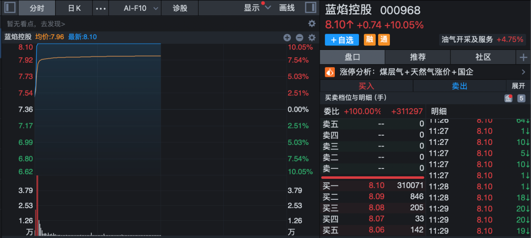 寒潮促使天然气价格飙升 石油产业链早间全线走强,油服工程方向领涨,板块指数盘中一度放量飙升逾6%,创8年来新高。潜能恒信、科力股份、石化油服等涨幅居前。 油气开采、天然气等细分板块指数创历史新高,可燃冰、燃气、页岩气等板块指数也创多年新高。巨力索具高开后仅约1分钟垂直涨停,蓝焰控股也仅约2分钟直线涨停,洲际油气、胜利股份、中泰股份等涨停或涨超10%。