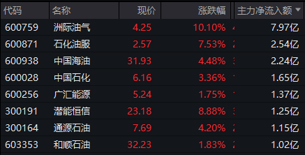 Wind实时监测数据显示,石油石化行业早间获得逾26亿元主力资金净流入。其中,洲际油气、中国海油、中国石化等8股获得超亿元主力资金净流入。