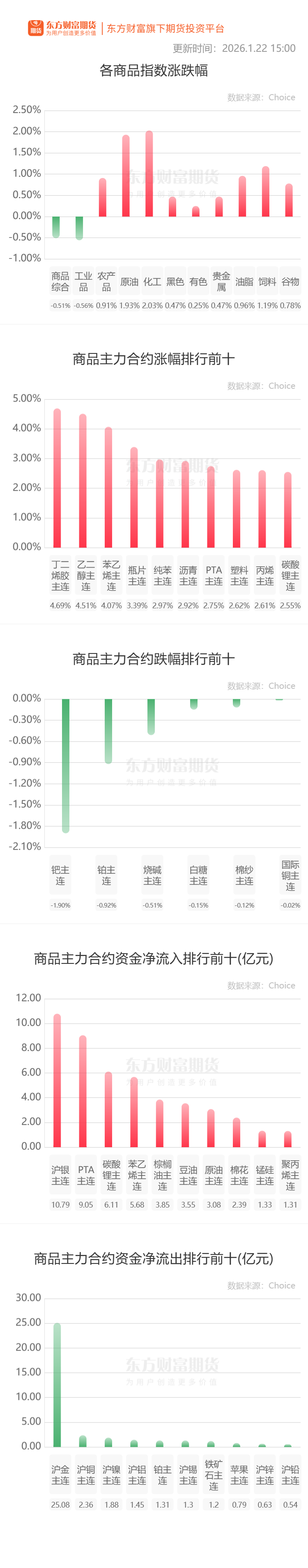 行情纵览![]() 宏观产经第一财经:国家统计局网站公布了31个省份2025年居民人均可支配收入情况。数据显示,去年7个省份居民人均可支配收入超过了5万元。 央视新闻:今天上午10点,国务院新闻办公室举行新闻发布会。发布会上,相关负责人介绍,第二轮土地承包到期后再延长30年试点扩大到7个整省,2500多万农户承包地总体顺延、保持稳定。 品种资讯黑色系期货 焦煤:1月22日蒙古国ETT公司炼焦煤进行线上竞拍,蒙5#原煤A15,V28,S1.0,G70,Mt3起拍价111.3美元/吨,挂牌数量12.8万吨全部成交,成交价124.3美元/吨,较昨日下跌2美元/吨,以上价格均不含税。供货地点为中国甘其毛都口岸监管区,供货时间为付款后120天,最后供应时间为2026年5月21日。 1月22日蒙古国ETT公司炼焦煤进行线上竞拍,1/3焦原煤A24、V37、S1.0、G65、Mt5起拍价68.4美元/吨,挂牌数量6.4万吨全部底价成交,以上价格均不含税。供货地点为甘其毛都口岸海关监管区,供货时间为付款后98天内,最后供应日期为2026年4月30日。(我的钢铁网) 不锈钢:2026年1月22日,50仓库口径无锡不锈钢库存总量537049吨,周环比减0.45%。200系周环比减1.57%,200系冷轧减热轧增,周内消化尚可,成交多集中在冷轧低价资源,热轧有所到货呈现窄幅增量;300系库存周环比减0.73%,300系冷热轧双减,华南钢厂发货恢复,在途资源有所增多,市场陆续到货,去库速度有所放缓;400系库存周环比增2.28%,400系冷热轧双增,月底华北大厂到货增多,且涨价后成交情况一般,整体呈现增量。(我的钢铁网) 农产品期货 生猪:据农业农村部监测,截至1月22日14:00时,全国农产品批发市场猪肉平均价格为18.50元/公斤,较前一日持平;鸡蛋平均价格为8.27元/公斤,较前一日上升0.9%。(新华财经) 棉花:1月21日,配额内(关税1%)中等质量进口棉完税成本12514元/吨,比国产标准级棉花价格低3305元/吨,较上周收窄49元/吨;滑准税进口棉完税成本13684元/吨,比国产棉价格低2135元/吨,较上周收窄100元/吨。国内棉价小幅下跌,内外价差微幅收窄。(国家粮油信息中心) 有色/贵金属期货 沪金:根据高盛1月22日发布的报告,该机构将2026年12月黄金价格预测上调至5400美元/盎司(此前预测值为4900美元/盎司)。报告称,高盛此前认为私人投资对黄金的多元化投资是黄金上行的重要因素,这一因素已经开始兑现。(上海证券报·中国证券网) 沪铜:国家统计局数据显示,2025年12月份精炼铜(电解铜)产量132.6万吨,同比增长9.1%;全年累计产量1472万吨,同比增长10.4%。(财联社) 1月22日国内市场电解铜现货库存33.52万吨,较15日增0.77万吨,较19日降0.28万吨; 上海库存19.59万吨,较15日增0.90万吨,较19日增0.42万吨; 广东库存4.75万吨,较15日降0.07万吨,较19日降0.12万吨; 江苏库存8.52万吨,较15日降0.07万吨,较19日降0.53万吨。(我的钢铁网) 碳酸锂:优质碳酸锂市场价格区间在162200-168300元/吨,行情较上一个工作日上调4400元,电池级碳酸锂市场价格区间在160800-168300元/吨,行情较上一个工作日上调4200元,工业级碳酸锂市场价格区间在158000-165000元/吨,行情较上一个工作日上调4250元。(财联社) 能化期货 乙二醇:本周国内乙二醇总产量38.53万吨,降低1.03万吨,环比降低2.59%。其中一体化产量23.95万吨,环比降低2.64%,煤化工产量14.58万吨,环比降低2.53%。(隆众资讯) 丁二烯胶:1月22日上海市场高顺顺丁橡胶价格区间上涨。上海市场高顺顺丁橡胶较上一工作日收盘区间上涨200—250元/吨,价格持续走高,业者随行就市报盘,成交待谈。(隆众资讯) 纯碱:国家统计局1月22日公布的数据显示,中国12月纯碱(碳酸钠)产量为334.7万吨,同比减少0.1%。1-12月累计产量为3957.2万吨,同比增长4.3%。(国家统计局) 玻璃:国家统计局1月22日公布的数据显示,中国12月平板玻璃产量为8829.3万重量箱,同比增加3.4%。1-12月累计产量为97591.0万重量箱,同比下滑3%。(国家统计局) 截止到20260122,全国浮法玻璃样本企业总库存5321.6万重箱,环比+20.3万重箱,环比+0.38%,同比+22.74%。折库存天数23.1天,较上期+0.1天。(隆众资讯) 晚间关注21:30 美国:PCE物价指数:季调 21:30 美国:当周首次申请失业金人数 (文章来源:东方财富研究中心) |