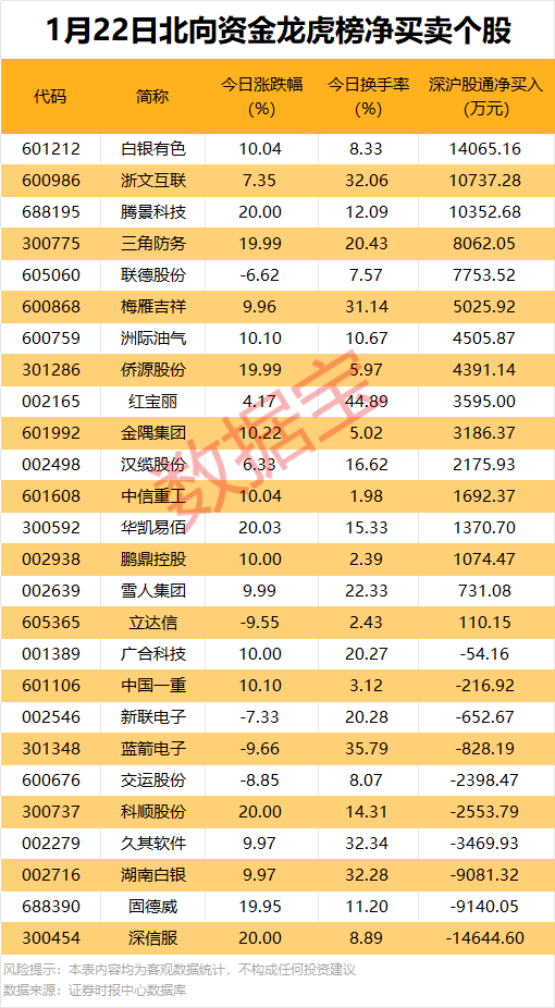 今日龙虎榜现身个股中,16股获北向资金净买入。净买入居首的是白银有色,金额为1.41亿元;浙文互联、腾景科技紧随其后,净买入金额均超1亿元。北向资金净卖出10股,深信服净卖出金额居首,为1.46亿元。