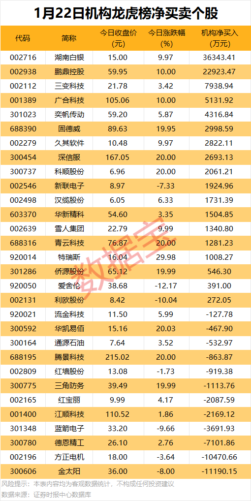 龙虎榜揭秘: 2股获机构大幅净买入 今日龙虎榜中,净买入个股有18只,净卖出的个股为12只。15股净买入金额均超千万元,湖南白银、鹏鼎控股获机构分别净买入3.63亿元、2.29亿元,居前;其次是三变科技、广合科技、奕帆传动,机构净买入金额均超4000万元。机构净卖出个股中,金太阳遭机构净卖出1.12亿元,居首;紧随其后是方正电机,净卖出金额为1.05亿元。