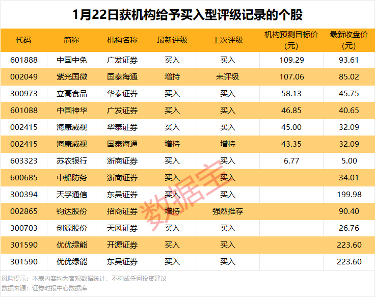 A股三大指数今日(1月22日)集体收涨,市场成交额2.72万亿元,较昨日放量超900亿元。盘面上,国产航母、可燃冰、大飞机等概念涨幅居前;国家大基金持股、重组蛋白等概念跌幅居前。 11股今日获机构买入评级 据证券时报·数据宝统计,今日机构研报共发布13条买入型评级记录,共涉及11股。海康威视、优优绿能关注度较高,均有2次机构买入型评级记录。今日获机构给予买入型评级的个股中,共有7条评级记录中对相关个股给出了预测目标价。以公布的预测目标价与最新收盘价进行对比显示,共有6股上涨空间超10%。 海康威视上涨空间最高,1月22日华泰证券预计公司目标价为45元,上涨空间达40.23%;上涨空间较高的个股还有苏农银行、立高食品,上涨空间分别为35.40%、27.06%。市场表现方面,机构给予买入型评级的个股今日平均上涨1.30%,表现强于沪指。股价上涨的有5只,涨停的有钧达股份。涨幅居前的有中船防务、天孚通信、中国神华,今日涨幅分别为7.49%、5.96%、1.42%。