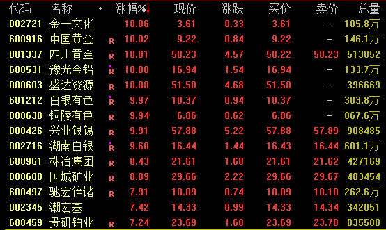 有色板块强势 有色板块盘中强势拉升,钴、镍、黄金概念等表现亮眼。截至收盘,四川黄金尾盘涨停创历史新高,白银有色斩获4连板,中国黄金、豫光金铅、盛达资源等均涨停。