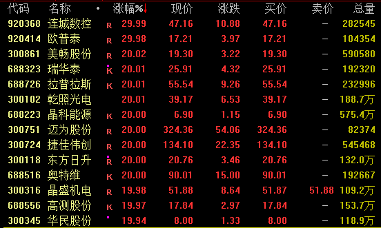 光伏概念大爆发 太空光伏概念带动整个光伏产业链股集体飙升,个股掀涨停潮。截至收盘,连城数控、欧普泰30%涨停,迈为股份、捷佳伟创、拉普拉斯、奥特维等十多股20%涨停,帝科股份涨约19%,隆基绿能、钧达股份、亚玛顿等十余股10%涨停。