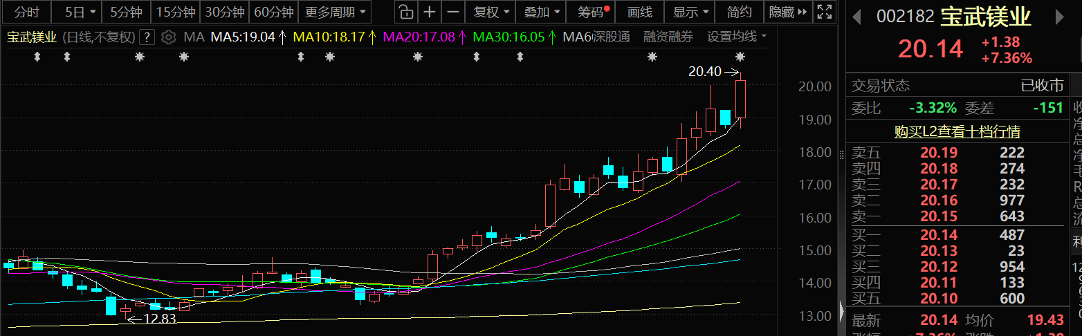 1月23日,宝武镁业股价出现明显上涨,截至23日收盘,宝武镁业涨7.36%,报20.14元/股。