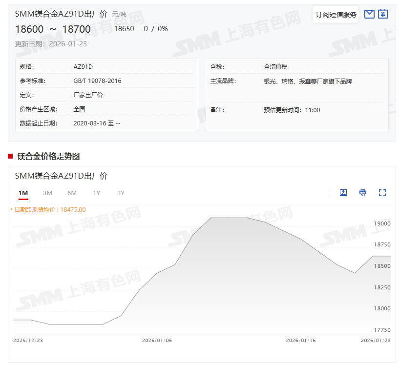 》点击查看SMM金属镁现货价格 》订购查看SMM金属现货历史价格走势 据SMM报价显示:镁合金AZ91D1月23日的报价为18600~18700元/吨,其均价为18650元/吨,较前一交易日持平。 从 SMM 调研的供需端情况来看,当前头部企业开工节奏稳定,陕西产区产量小幅增加,市场现货供应整体偏紧;而临近春节,下游压铸厂及终端厂家订单逐步缩减,镁合金生产企业暂停扩产,市场整体维持紧平衡态势。短期来看,镁锭价格或存进一步下行可能,或将拖累镁合金基准价续跌,而 A00 铝锭价格高位震荡则对镁合金加工费形成较强支撑,春节前镁合金价格整体波动空间有限,节后市场走势仍需重点关注需求端恢复节奏及成本端各类变量变化。 而在行业发展趋势层面,随着新能源汽车、机器人等新兴领域轻量化需求的持续攀升,兼具环保、节能、产品精度高等优势的半固态镁合金成型技术,正逐步替代传统压铸工艺成为行业主流解决方案。此次近百台半固态镁合金设备订单的集中落地,不仅直接印证了头部装备企业的核心技术实力与市场认可度,更将从装备端推动镁合金产业向集群化、规模化方向加速发展,为我国制造业高端化转型注入强劲动能。据测算,中长期国内半固态镁合金设备市场规模有望突破 40 亿元,叠加各新兴领域轻量化需求的持续爆发,镁合金行业整体增长空间广阔。 推荐阅读: 》双巨头斩获近百台订单 半固态镁合金成型设备迎应用热潮【SMM调研】 |