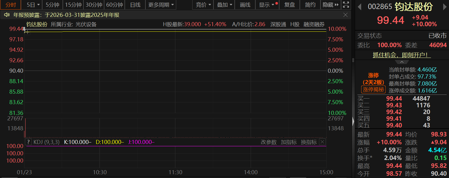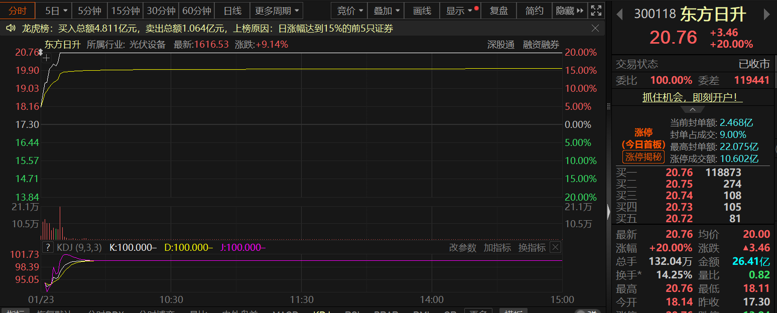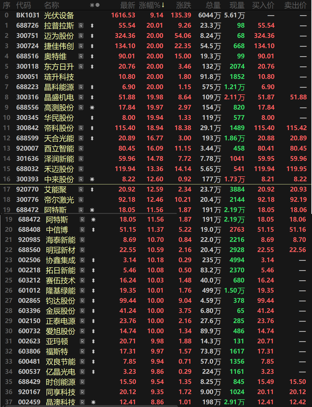个股方面,光伏设备板块更是掀起了轰轰烈烈的“涨停潮”!拉普拉斯、迈为股份、捷佳伟创、奥特维、东方日升、琏升科技、晶科能源等7股20CM拉升涨停,晶盛机电、高测股份、华民股份等多股涨逾10%,协鑫集成、拓日新能、隆基绿能、钧达股份、双良节能、爱旭股份等近14股一同封死涨停板。 消息面上,特斯拉CEO马斯克在瑞士达沃斯世界经济论坛年会期间,在与贝莱德CEO拉里·芬克的对谈中明确力挺太空光伏,并披露关键产能规划。他表示,SpaceX与特斯拉正同步推进太阳能产能提升,目标在未来三年内实现每年100GW的太阳能制造能力。 中信证券在近期的研报中表示,如果按照马斯克在社交媒体X上提出的每年100GW太空算力部署测算,预计远期市场空间有望达到5.6万亿元。 市场分析认为,太空光伏是航天活动首选能源,太空算力中心部署打开新空间。随着低轨通信卫星向高通量发展,搭载光伏组件的太阳翼需求扩张已成未来发展趋势。 且据财联社方面消息,商业航天进入规模化部署新阶段,将直接带动太空光伏长期需求。太空光伏面临从高效砷化镓到规模化硅基HJT,再到远期钙钛矿叠层的技术迭代路径。国际能源署预计到2040年太空光伏市场规模将突破5000亿美元,2050年有望达到1.2万亿美元。 太空光伏“前景无限”?多家光伏企业早已入局! 受此消息刺激,今日光伏设备板块全线爆发。而今日股价涨幅高达16.77%的天合光能,在太空光伏板块也有相关布局。 天合光能 天合光能在1月15日前后接受媒体采访时表示,公司于 2026 年 1 月开发全行业首片大面积 P 型 HJT/钙钛矿叠层电池,效率达 31.5%。电池基于 P-型 Cz 硅片的量产 HJT 底电池技术,采用狭缝涂布和大面积均匀钙钛矿钝化技术,厚度仅为 75 微米。 作为拥有光伏科学与技术全国重点实验室的行业领先企业,公司在太空光伏相关的晶体硅电池(HJT 等)、钙钛矿叠层电池、III-V 族砷化镓多结电池三大方向已经进行了长期完整布局,并且取得了领先性的研发成果。 其中,公司基于 P 型 PERC 的电池结构持续领先,截至目前维持 24.1%的世界纪录, HJT 电池技术持续保持大面积效率达 27.08%的世界纪录;钙钛矿/晶体硅叠层电池技术亦保持行业领先,小面积钙钛矿叠层电池效率达 35%,大面积叠层电池效率 32.6%,组件功率达到 886Wp,公司钙钛矿专利申请专利合计 689 项,排名全球第一。 公司还承担国家重点研发计划,III-V 族薄膜电池与晶硅的叠层电池低成本制备关键技术。公司是该项目的负责单位,目标是突破 39.5%的电池效率。 天合光能还表示,公司作为拥有光伏科学与技术全国重点实验室的行业领先企业,在太空光伏相关的晶体硅电池(HJT 等)、钙钛矿叠层电池、III-V 族砷化镓多结电池三大方向已经进行了长期完整布局,并且取得了领先性的研发成果。 在推广商业应用方面,公司基于其的领先成果与国内航天院所及企业密切合作,与海外领先航天航空机构合作,积累了大量空间太阳能方向的实践经验。公司相信光伏技术在太空领域有广阔的前景,也坚信天合会成为天空太阳能领域的领先者。