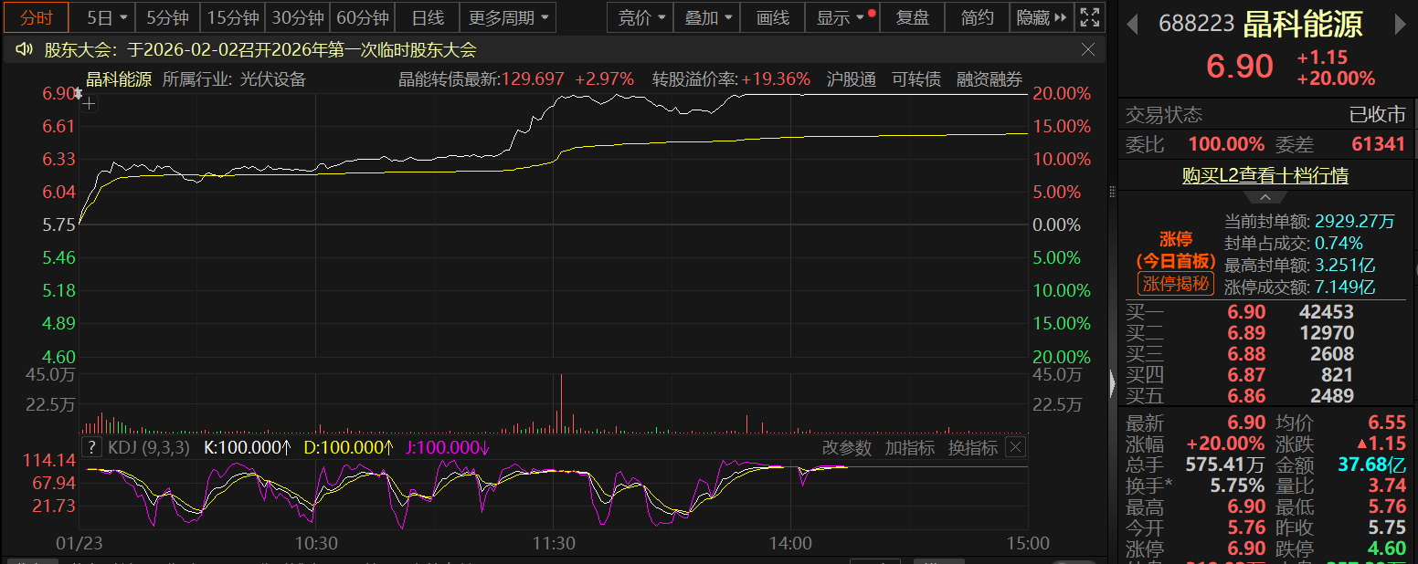 截至日间收盘,东方日升以20%的涨幅报20.76元/股。 晶科能源 此前在接受投资者互动调研时,晶科能源曾被问及“如何看待太空算力中光伏市场空间潜力和技术路线展望”的话题,公司回应称,业内分析指出,未来低轨通信卫星、轨道式太阳能电站及地外数据中心等空间能源应用场景,均需依托超高效率、轻质化的光伏技术。第三方研究机构表示,钙钛矿叠层电池实现较高发电效率的同时轻量化能力也较为突出,应用场景有望从当前的航天器供电逐步拓展至空间太阳能电站定向输电,最终支撑 2035 年后 GW级太空数据中心规模化部署。公司基于 N 型 TOPCon 的钙钛矿叠层电池转化效率突破 34.76%,刷新了此前保持的同类叠层电池34.22%的最高转换效率,连续技术突破正为这些长远愿景奠定坚实基础。