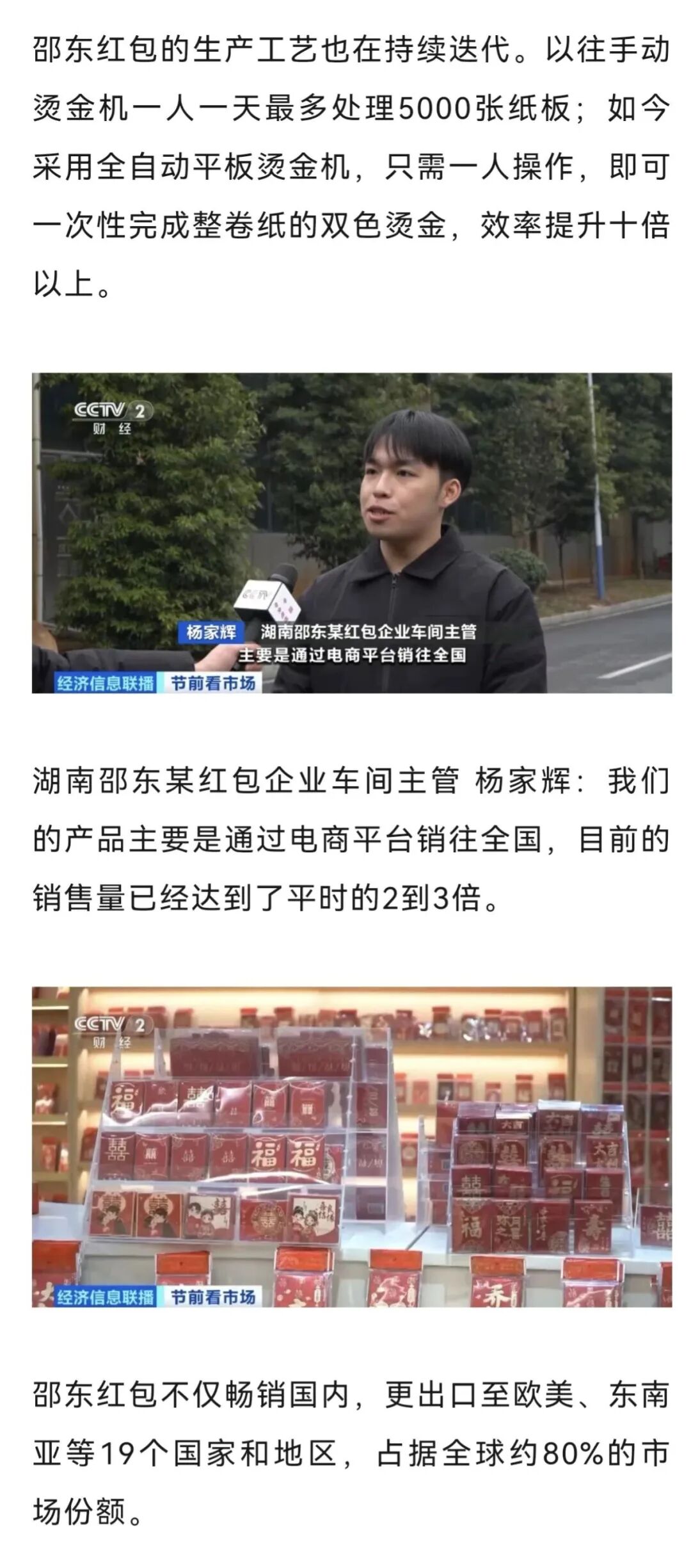 春节将至,全球市场对红包的需求持续升温。产自湖南邵东的纸质红包,已占据全球市场份额约八成。眼下,当地企业正开足马力赶制订单,日产红包超过630万个,供应海内外市场。