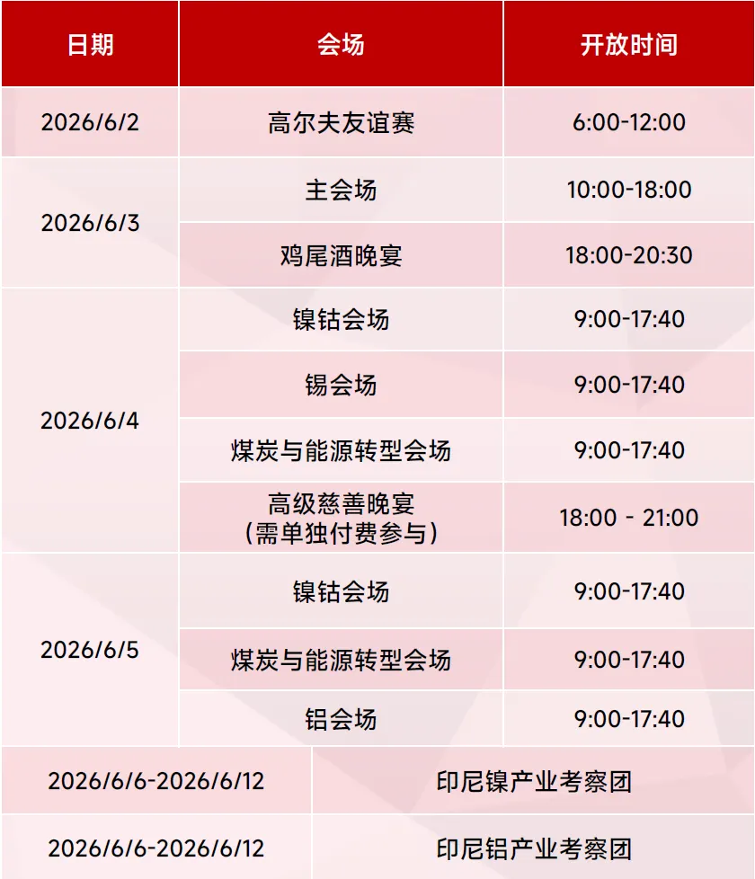 75折超级早鸟价为本届大会最低报名档位,仅限当前阶段,倒计时结束后不再回退。随着议程、嘉宾及参会企业名单持续释放,报名价格与参会名额将同步收紧,1月31日后统一调整至85折。 越早锁定,不仅意味着更低的参会成本,也意味着更早进入产业核心圈层,优先参与重点分会场与高质量商务对接。对关注资源端变化、布局新能源与关键金属机会的企业而言,现在报名,是兼顾性价比与确定性的唯一窗口期。 75 折超级早鸟优惠 倒计时5天 最低价阶段,不要错过。 会议日程概览