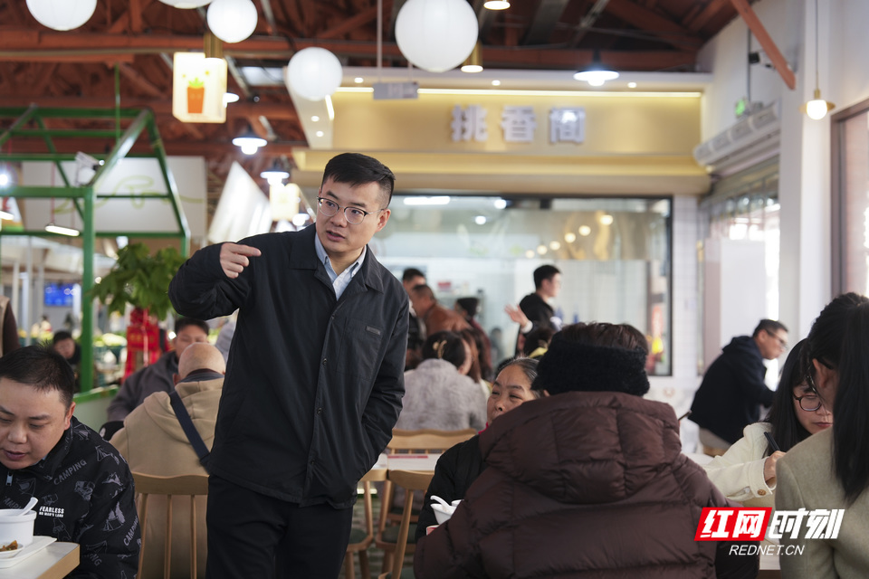 靠门边的长桌上,左宗卓和几位同事边吃边聊。他们都是附近梦洁公司的员工。“从试营业我们就来这儿吃了,”左宗卓夹了一筷子菜,“五块钱一盘,还能两样拼,味道好,划算。”近两周,集市里的便民食堂成了他们固定的“第二食堂”。 木结构的屋顶下面,上班的、买菜的、带孩子的,都在这片烟火气里找到了自己的位置。