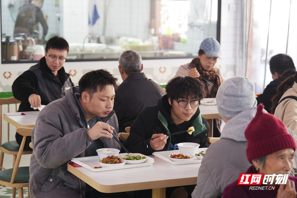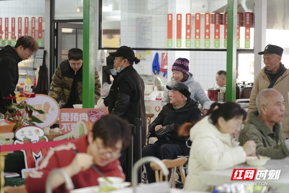 解女士推着梁先生,梁先生稳稳地端着餐盘,两人穿过一排排木质餐桌。空气里混着麻油猪血的香气、小炒肉的油香和刚出锅米饭的热气。