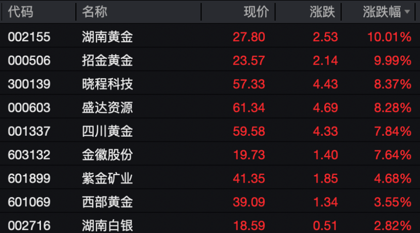 此外,银行板块整体走强,工农中建四大行涨幅均超过1%。电力设备、钢铁、农林牧渔等板块盘中领跌。 A股贵金属概念股盘中集体大涨 A股贵金属概念股再度集体大涨,晓程科技盘中涨幅超过14%,后有所收窄,湖南黄金、招金黄金、中国黄金等涨停,白银有色盘中一度涨停,另有多股跟涨。
