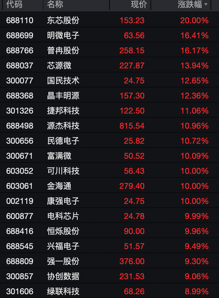 电子板块走强,板块涨幅超过1%。东芯股份“20cm”涨停,明微电子、普冉股份、芯源微、源杰科技等多股涨幅超过10%,康强电子、可川科技、金海通、电科芯片等多股涨停。