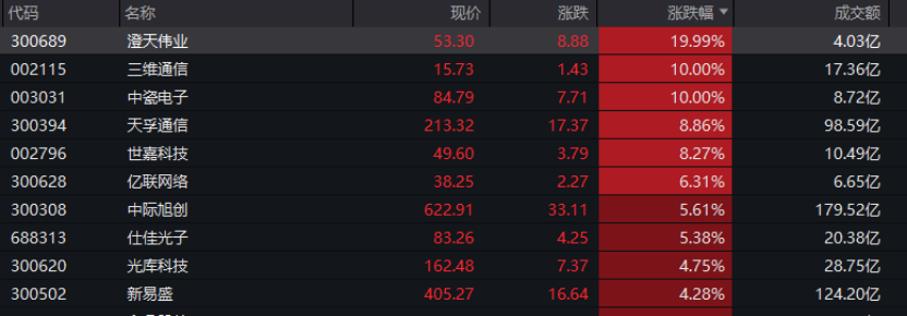 主要行业板块和赛道方面,若按照申万一级行业划分,通信板块领涨,板块涨幅超过2%,澄天伟业“20cm”涨停,中瓷电子、三维通信等股票亦涨停。“易中天”再度走强,其中天孚通信盘中涨幅一度超过11%,中际旭创盘中涨幅一度接近7%,新易盛盘中涨幅一度超过6%,截至午间收盘,该三股涨幅均有所收窄。
